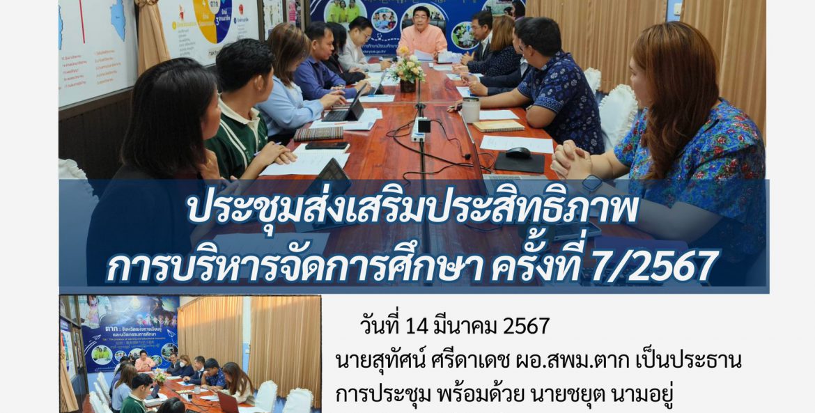 วันที่ 14 มีนาคม 2567 นายสุทัศน์ ศรีดาเดช ผอ.สพม.ตาก เป็นประธานการประชุม พร้อมด้วย นายชยุต นามอยู่ นายจักรรินทร์ แจ่มใส รอง ผอ.สพม.ตาก และผอ.กลุ่มงาน ร่วมประชุมประชุมส่งเสริมประสิทธิภาพการบริหารจัดการศึกษา สำนักงานเขตพื้นที่การศึกษามัธยมศึกษาตากครั้งที่ 7/2567ณ ห้องลานสาง สพม.ตาก