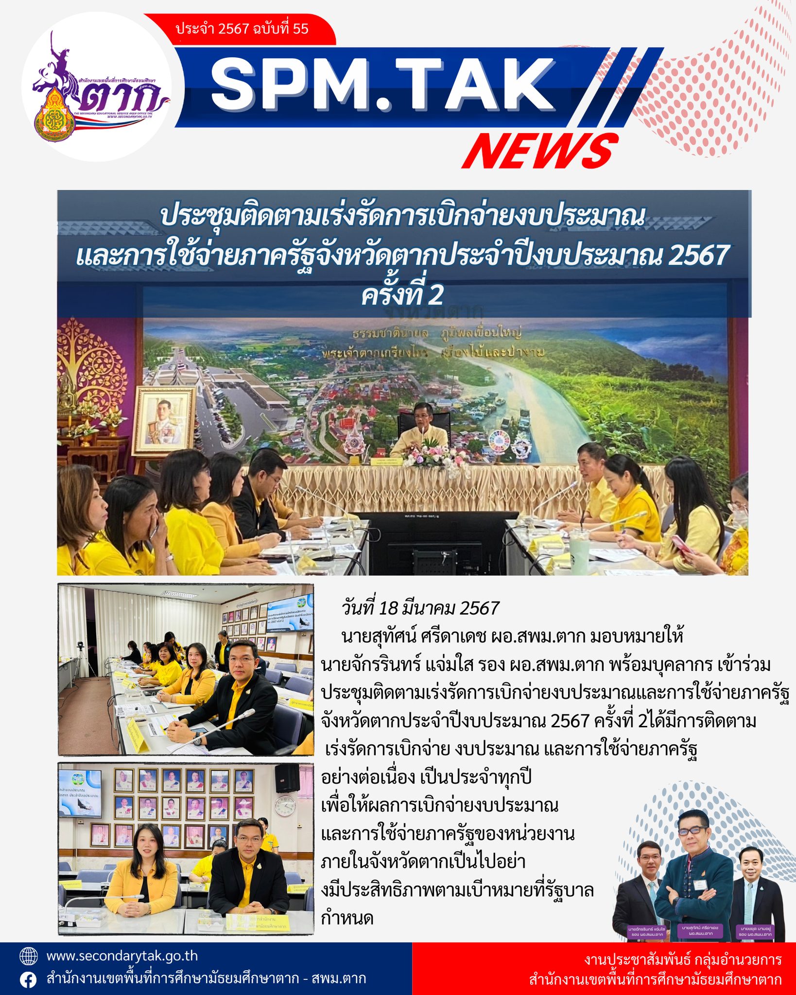 วันที่ 18 มีนาคม 2567 นายสุทัศน์ ศรีดาเดช ผอ.สพม.ตาก มอบหมายให้ นายจักรรินทร์ แจ่มใส รอง ผอ.สพม.ตาก พร้อมบุคลากร เข้าร่วมประชุมติดตามเร่งรัดการเบิกจ่ายงบประมาณและการใช้จ่ายภาครัฐจังหวัดตากประจำปีงบประมาณ 2567 ครั้งที่ 2ได้มีการติดตามเร่งรัดการเบิกจ่าย งบประมาณ และการใช้จ่ายภาครัฐ อย่างต่อเนื่อง เปีนประจำทุกปี เพื่อให้ผลการเบิกจ่ายงบประมาณ และการใช้จ่ายภาครัฐของหน่วยงานภายในจังหวัดตากเปีนไปอย่างมีประสิทธิภาพตามเบีาหมายที่รัฐบาลกำหนด