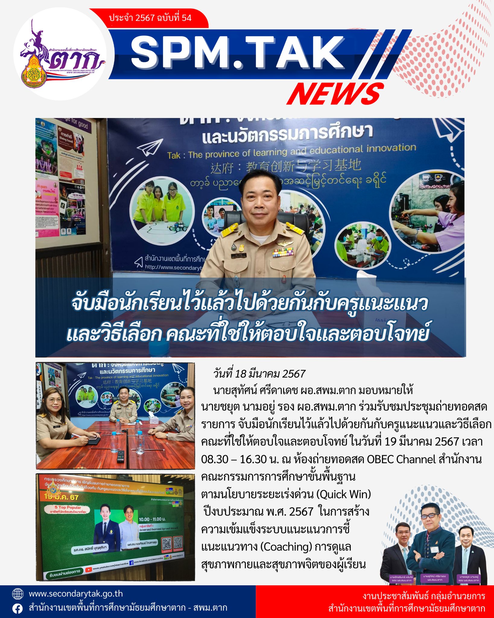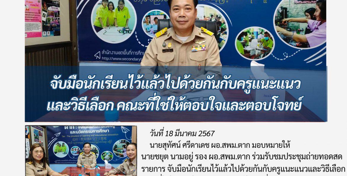 วันที่ 18 มีนาคม 2567 นายสุทัศน์ ศรีดาเดช ผอ.สพม.ตาก มอบหมายให้นายชยุต นามอยู่ รอง ผอ.สพม.ตาก ร่วมรับชมประชุมถ่ายทอดสด รายการ จับมือนักเรียนไว้แล้วไปด้วยกันกับครูแนะแนวและวิธีเลือกคณะที่ใช่ให้ตอบใจและตอบโจทย์ ในวันที่ 19 มีนาคม 2567 เวลา 08.30 – 16.30 น. ณ ห้องถ่ายทอดสด OBEC Channel สำนักงานคณะกรรมการการศึกษาขั้นพื้นฐาน ตามนโยบายระยะเร่งด่วน (Quick Win) ปีงบประมาณ พ.ศ. 2567 ในการสร้าง ความเข้มแข็งระบบแนะแนวการชี้ แนะแนวทาง (Coaching) การดูแล สุขภาพกายและสุขภาพจิตของผู้เรียน