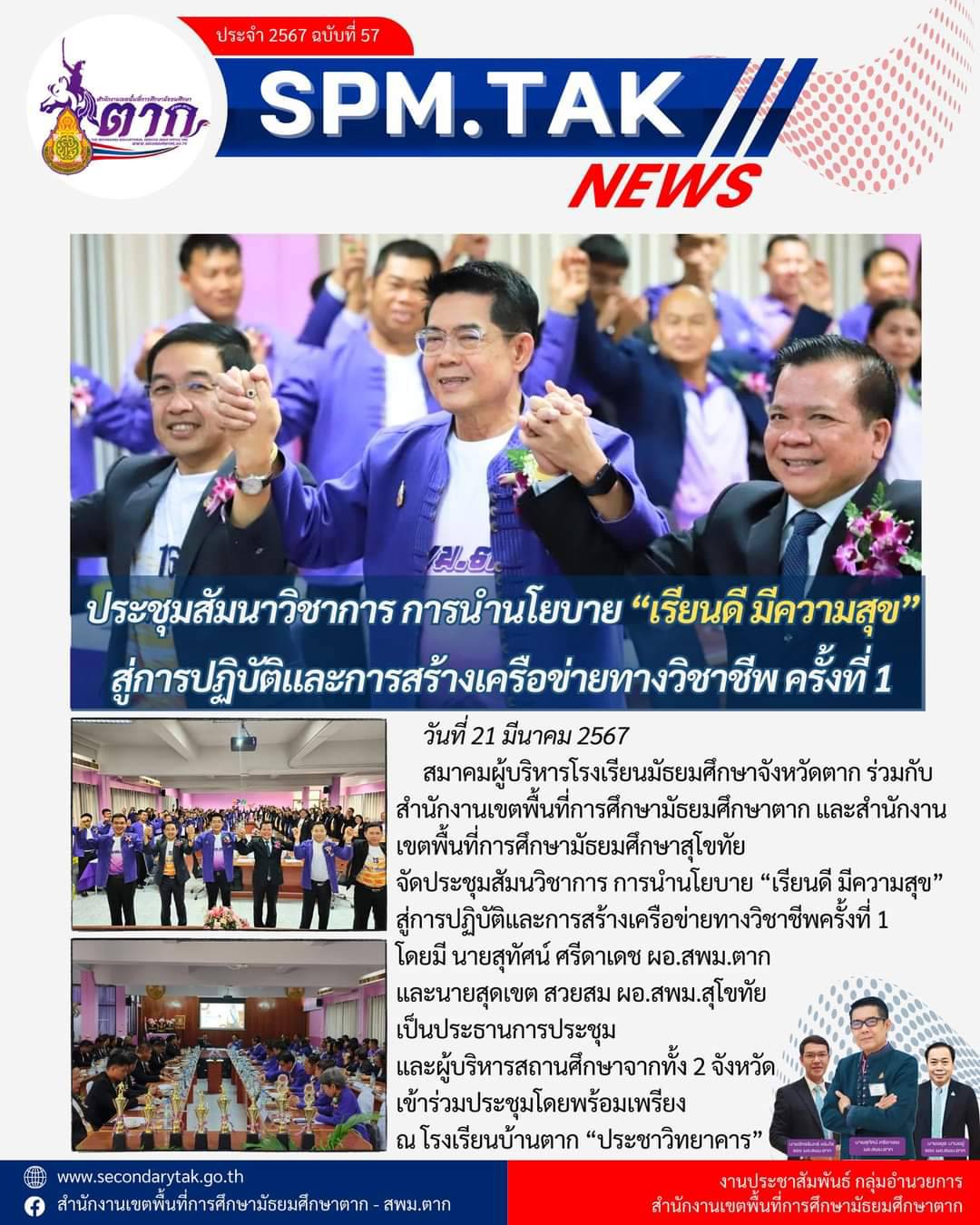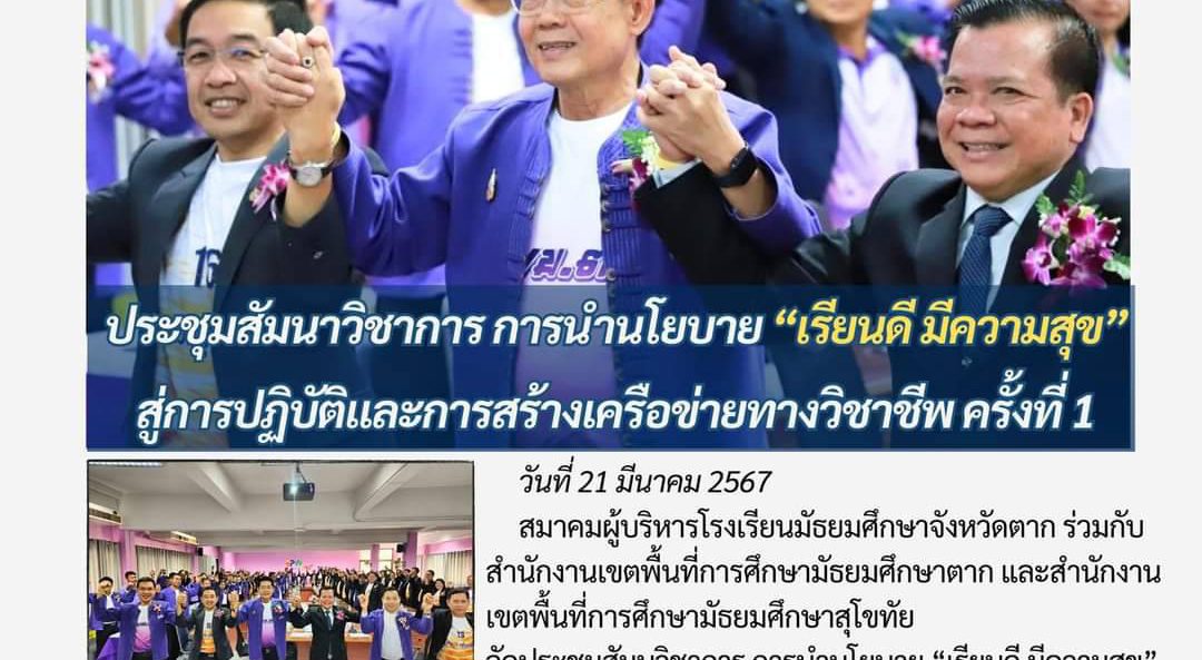 วันที่ 21 มีนาคม 2567 สมาคมผู้บริหารโรงเรียนมัธยมศึกษาจังหวัดตาก ร่วมกับสำนักงานเขตพื้นที่การศึกษามัธยมศึกษาตาก และสำนักงานเขตพื้นที่การศึกษามัธยมศึกษาสุโขทัย จัดประชุมสัมนวิชาการ การนำนโยบาย “เรียนดี มีความสุข” สู่การปฏิบัติและการสร้างเครือข่ายทางวิชาชีพครั้งที่ 1 โดยมี นายสุทัศน์ ศรีดาเดช ผอ.สพม.ตาก และนายสุดเขต สวยสม ผอ.สพม.สุโขทัย เป็นประธานการประชุม และผู้บริหารสถานศึกษาจากทั้ง 2 จังหวัด เข้าร่วมประชุมโดยพร้อมเพรียง ณ โรงเรียนบ้านตาก “ประชาวิทยาคาร”