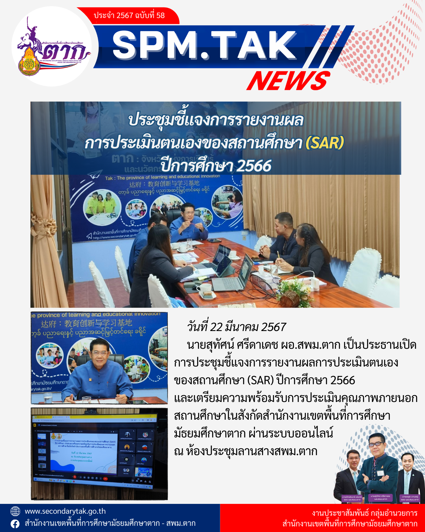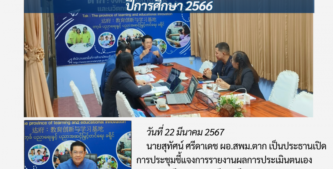 วันที่ 21 มีนาคม 2567 นายสุทัศน์ ศรีดาเดช ผอ.สพม.ตาก เป็นประธานเปิด การประชุมชี้แจงการรายงานผลการประเมินตนเอง ของสถานศึกษา (SAR) ปีการศึกษา 2566 และเตรียมความพร้อมรับการประเมินคุณภาพภายนอกสถานศึกษาในสังกัดสำนักงานเขตพื้นที่การศึกษามัธยมศึกษาตาก ผ่านระบบออนไลน์ โปรแกรม Zoom Meeting ณ ห้องประชุมลานสางสพม.ตาก