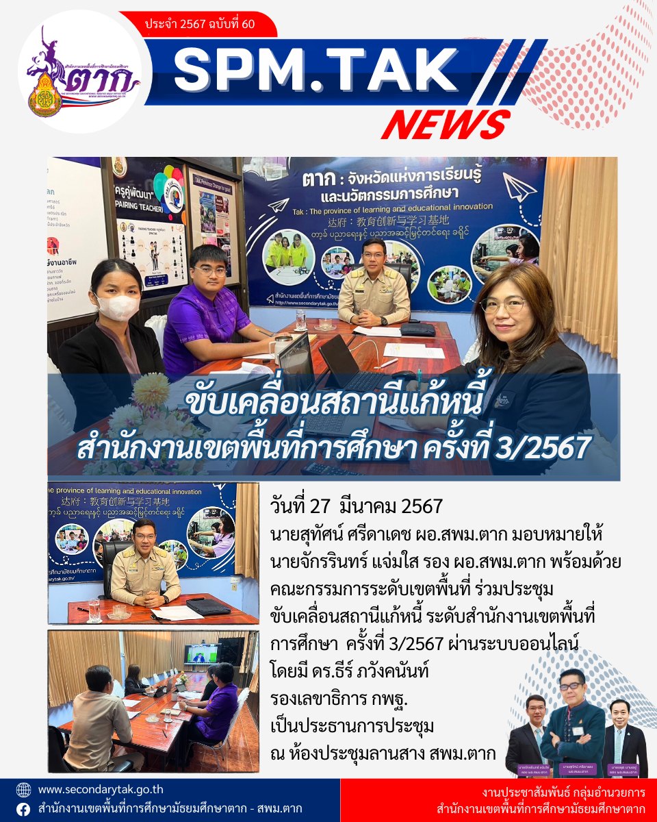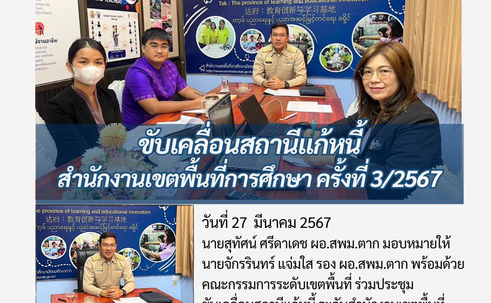 นายสุทัศน์ ศรีดาเดช ผอ.สพม.ตาก มอบหมายให้ นายจักรรินทร์ แจ่มใส รอง ผอ.สพม.ตาก พร้อมด้วย คณะกรรมการระดับเขตพื้นที่ ร่วมประชุม ขับเคลื่อนสถานีแก้หนี้ ระดับสำนักงานเขตพื้นที่ การศึกษา ครั้งที่ 3/2567 ผ่านระบบออนไลน์ โดยมี ดร.ธีร์ ภวังคนันท์ รองเลขาธิการ กพธู. เป็นประธานการประชุม ณ ห้องประชุมลานสาง สพม.ตาก