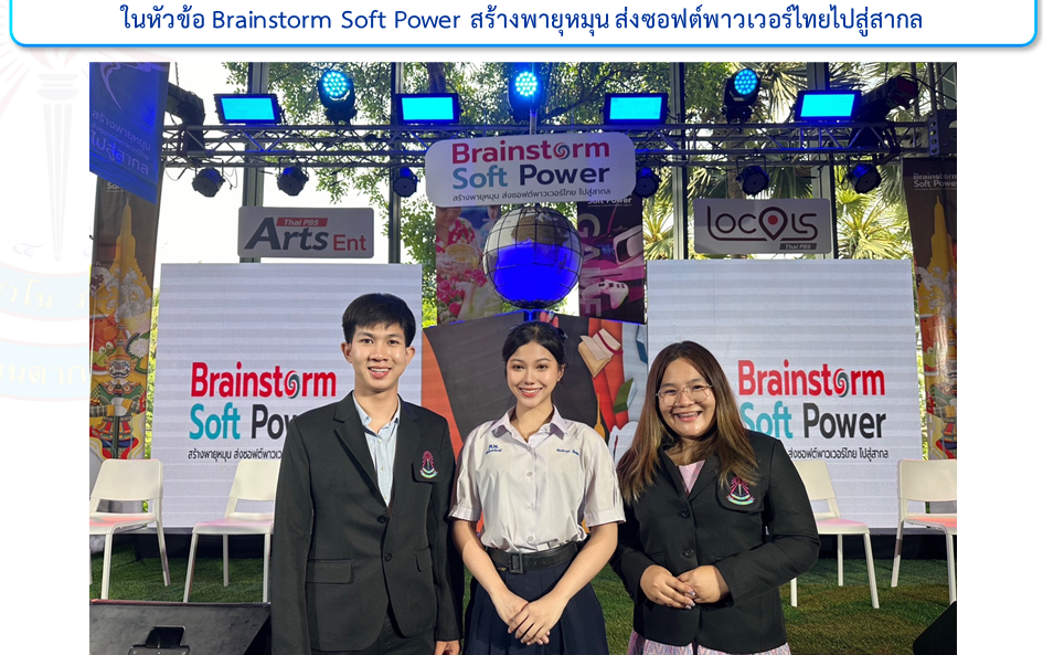 วันที่ 28 มีนาคม พ.ศ. 2567 ดร.ภูธนภัส พุ่มไม้ ผู้อำนวยการโรงเรียนตากพิทยาคม มอบหมายให้นายดนุพล พุ่มสลิด และนางสาวพิมพิไล หล้าใจ ครูกลุ่มสาระการเรียนรู้ภาษาไทย นำนางสาวอัจฉริยาพร อ๊อดทรัพย์ นักเรียนโรงเรียนตากพิทยาคมเข้าร่วมรายการศิลป์สโมสรเสวนาในหัวข้อ Brainstorm Soft Power สร้างพายุหมุน ส่งซอฟต์พาวเวอร์ไทยไปสู่สากล ณ ลานไม้ อาคาร A ไทยพีบีเอส