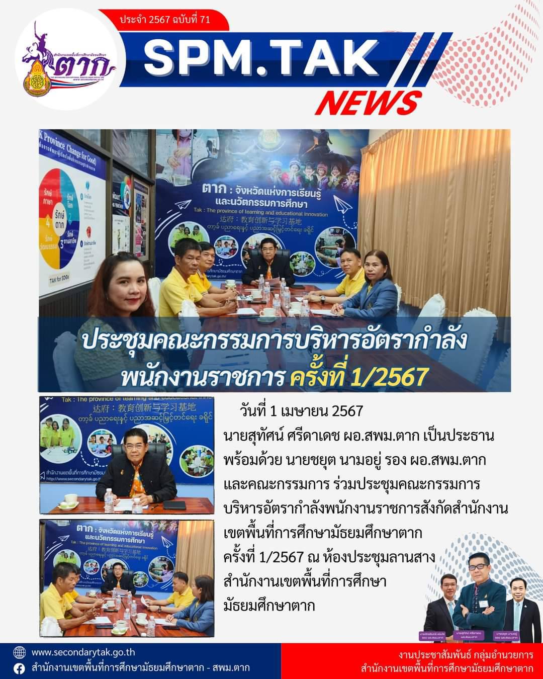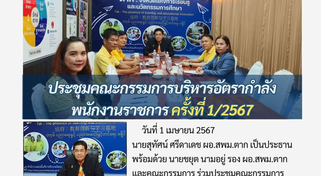 วันที่ 1 เมษายน 2567 นายสุทัศน์ ศรีดาเดช ผอ.สพม.ตาก เป็นประธานพร้อมด้วย นายชยุต นามอยู่ รอง ผอ.สพม.ตาก และคณะกรรมการ ร่วมประชุมคณะกรรมการบริหารอัตรากำลังพนักงานราชการสังกัดสำนักงานเขตพื้นที่การศึกษามัธยมศึกษาตาก ครั้งที่ 1/2567 ณ ห้องประชุมลานสางสำนักงานเขตพื้นที่การศึกษา มัธยมศึกษาตาก