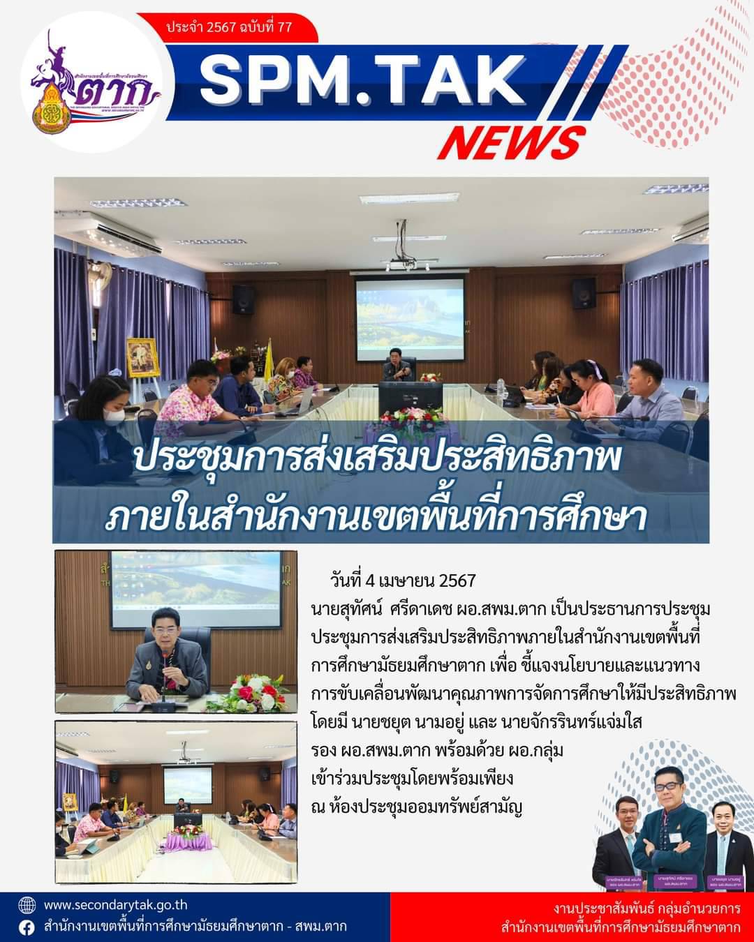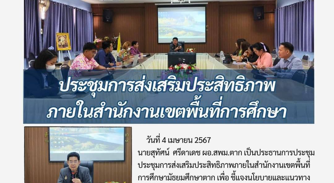 วันที่ 4 เมษายน 2567 นายสุทัศน์ ศรีดาเดช ผอ.สพม.ตาก เป็นประธานการประชุม ประชุมการส่งเสริมประสิทธิภาพภายในสำนักงานเขตพื้นที่ การศึกษามัธยมศึกษาตาก เพื่อ ชี้แจงนโยบายและแนวทาง การขับเคลื่อนพัฒนาคุณภาพการจัดการศึกษาให้มีประสิทธิภาพ โดยมี นายชยุต นามอยู่ และ นายจักรรินทร์แจ่มใส รอง ผอ.สพม.ตาก พร้อมด้วย ผอ.กลุ่ม เข้าร่วมประชุมโดยพร้อมเพียง ณ ห้องประชุมออมทรัพย์สามัญ