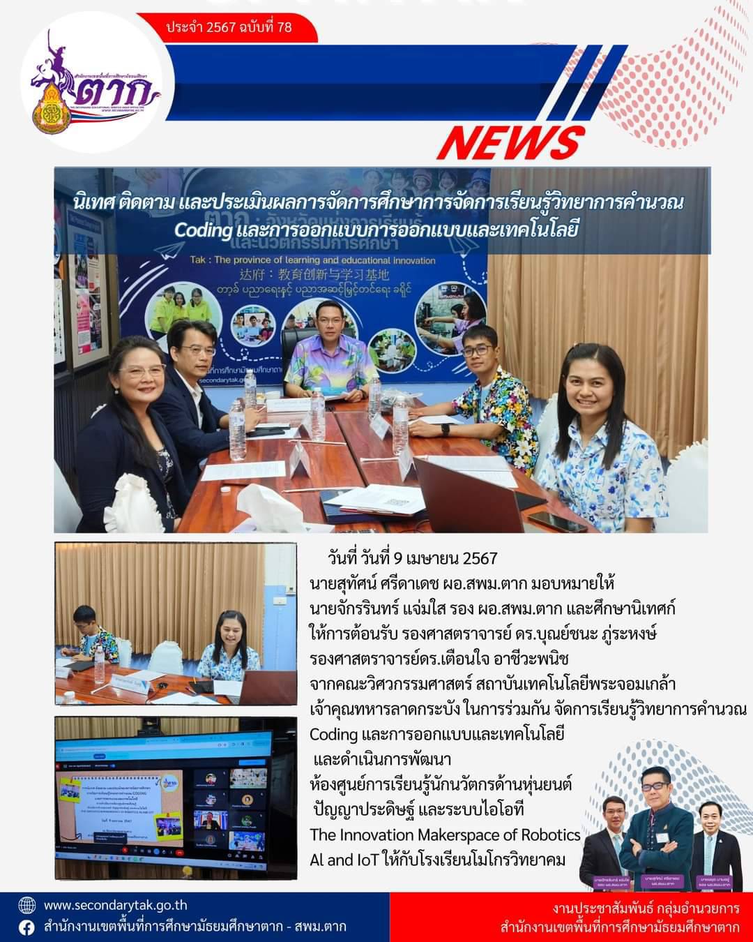 วันที่ วันที่ 9 เมษายน 2567 นายสุทัศน์ ศรีดาเดช ผอ.สพม.ตาก หมอบหมายให้นายจักรรินทร์ แจ่มใส รอง ผอ.สพม.ตาก ร่วมกับ รองศาสตราจารย์ ดร.บุณย์ชนะ ภู่ระหงษ์ รองศาสตราจารย์ ดร.เตือนใจ อาชีวะพนิช ศน.พรทิพย์ อินอยู่ และศน.สมเจตน์ เนียมก้อน นิเทศ ติดตาม และประเมินผลการจัดการศึกษาการจัดการเรียนรูัวิทยาการคำนวณCoding และการออกแบบการออกแบบและเทคโนโลยี โรงเรียนโมโกรวิทยาคม โดยนายอลงกต เทอดโยธิน ผู้อำนวยการโรงเรียนโมโกรวิทยาคม และคณะครู