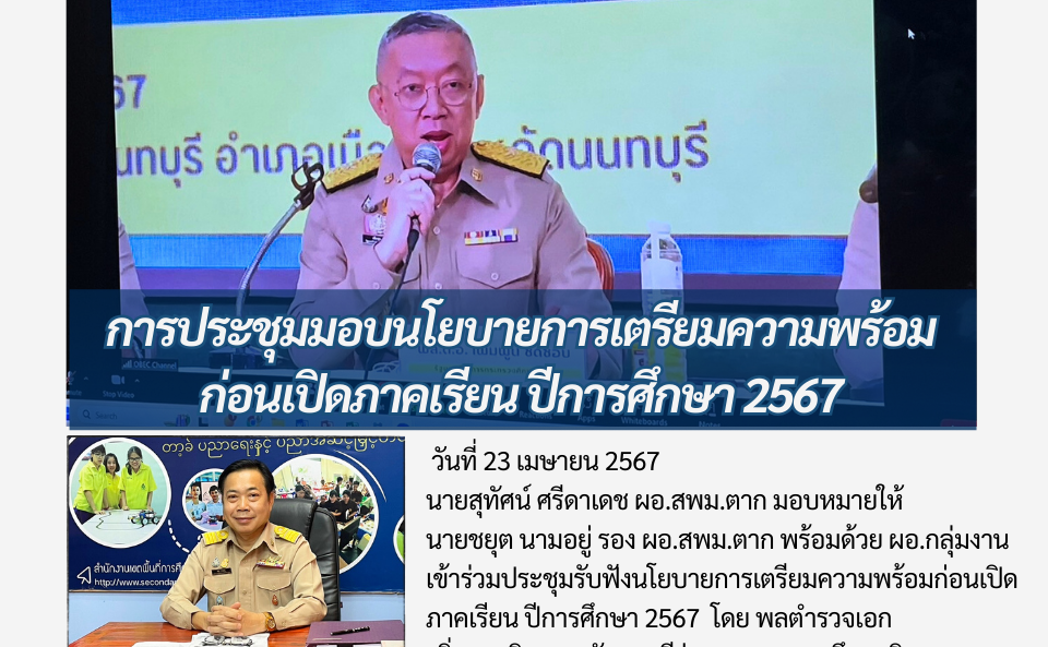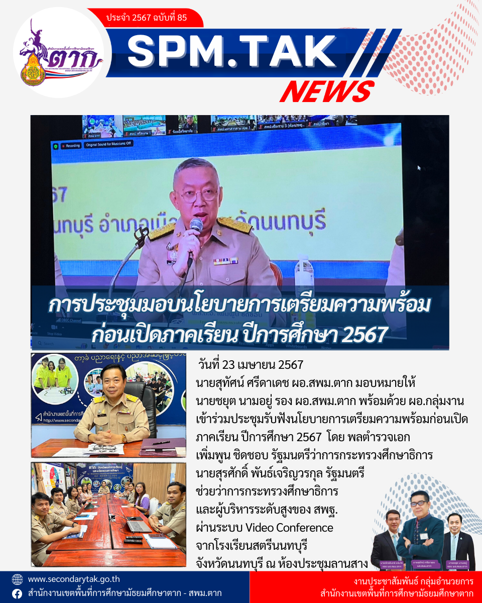 วันที่ 23 เมษายน 2567 นายสุทัศน์ ศรีดาเดช ผอ.สพม.ตาก มอบหมายให้ นายชยุต นามอยู่ รอง ผอ.สพม.ตาก พร้อมด้วย ผอ.กลุ่มงาน เข้าร่วมประชุมรับฟังนโยบายการเตรียมความพร้อมก่อนเปิดภาคเรียน ปีการศึกษา 2567 โดย พลตำรวจเอก เพิ่มพูน ชิดชอบ รัฐมนตรีว่าการกระทรวงศึกษาธิการ นายสุรศักดิ์ พันธ์เจริญวรกุล รัฐมนตรี ช่วยว่าการกระทรวงศึกษาธิการ และผู้บริหารระดับสูงของ สพฐ. ผ่านระบบ Video Conference จากโรงเรียนสตรีนนทบุรี จังหวัดนนทบุรี ณ ห้องประชุมลานสาง