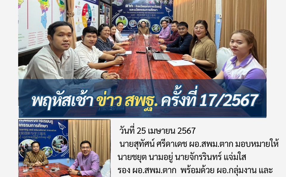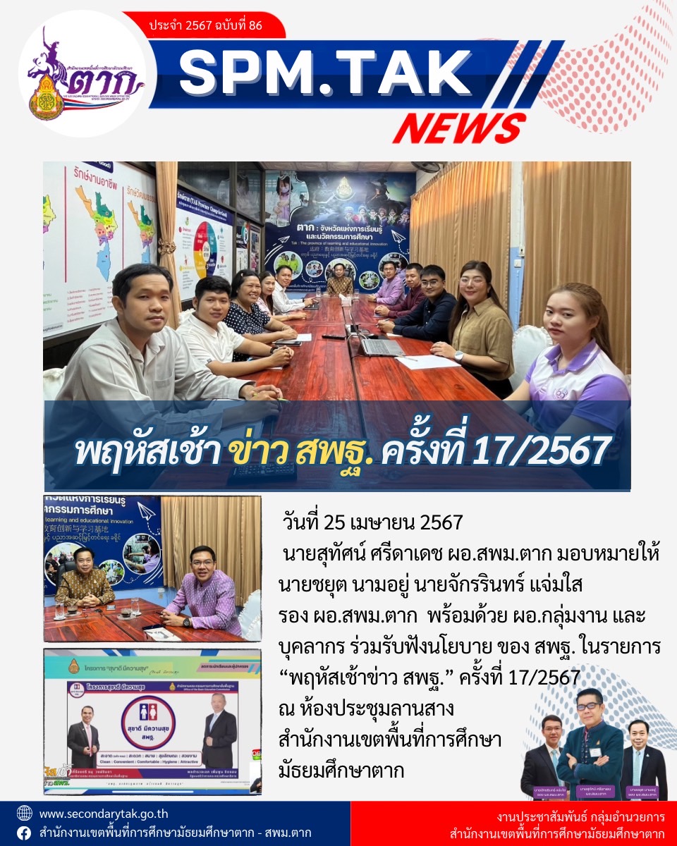 วันที่ 25 เมษายน 2567 นายสุทัศน์ ศรีดาเดช ผอ.สพม.ตาก มอบหมายให้ นายชยุต นามอยู่ นายจักรรินทร์ แจ่มใส รอง ผอ.สพม.ตาก พร้อมด้วย ผอ.กลุ่มงาน และบุคลากร ร่วมรับฟังนโยบาย ของ สพฐ. ในรายการ “พฤหัสเช้าข่าว สพฐ.” ครั้งที่ 17/2567 ณ ห้องประชุมลานสาง สำนักงานเขตพื้นที่การศึกษามัธยมศึกษาตาก