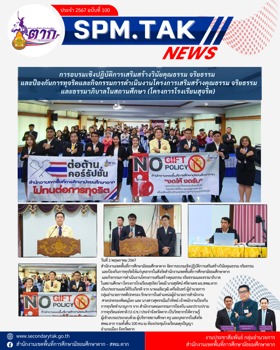 วันที่ 2 พฤษภาคม 2567 สำนักงานเขตพื้นที่การศึกษามัธยมศึกษาตาก จัดการอบรมเชิงปฏิบัติการเสริมสร้างวินัยคุณธรรม จริยธรรม และป้องกันการทุจริตให้แก่บุคลากรในสังกัดสำนักงานเขตพื้นที่การศึกษามัธยมศึกษาตาก และกิจกรรมการดำเนินงานโครงการเสริมสร้างคุณธรรม จริยธรรมและธรรมาภิบาล ในสถานศึกษา (โครงการโรงเรียนสุจริต) โดยมี นายสุทัศน์ ศรีดาเดช ผอ.สพม.ตาก เป็นประธานและได้รับเกียรติ จาก นายเฉลิมวุฒิ เครืออินทร์ ผู้อำนวยการ กลุ่มอำนวยการคดีปกครอง รักษาการในตำแหน่งผู้อำนวยการสำนักงาน ศาลปกครองพิษณุโลก และ นางสาวสุพรรณีแก้วทิพย์ เจ้าพนักงานป้องกัน การทุจริตชำนาญการ จาก สำนักงานคณะกรรมการป้องกัน และปราบปราม การทุจริตแห่งชาติ (ป.ป.ช.) ประจำจังหวัดตาก เป็นวิทยากรให้ความรู้ ผู้เข้าอบรมประกอบด้วย ผู้บริหารสถานศึกษา ครู และบุคลากรในสังกัด สพม.ตาก รวมทั้งสิ้น 100 คน ณ ห้องประชุมโรงเรียนผดุงปัญญา อำเภอเมือง จังหวัดตาก