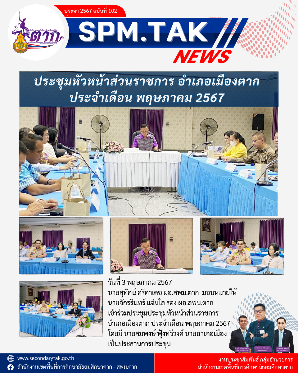ประชุมหัวหน้าส่วนราชการ อำเภอเมืองตาก ประจำเดือน พฤษภาคม 2567 วรวุฒิ เนื้อนิ่ม 3 พฤษภาคม 2567 วันที่ 3 พฤษภาคม 2567 นายสุทัศน์ ศรีดาเดช ผอ.สพม.ตาก มอบหมายให้ นายจักรรินทร์ แจ่มใส รอง ผอ.สพม.ตาก เข้าร่วมประชุมหัวหน้าส่วนราชการ อำเภอเมืองตาก ประจำเดือน พฤษภาคม 2567 โดยมี นายสมพงษ์ ฟุ้งทวีวงศ์ นายอำเภอเมืองตาก เป็นประธานการประชุม จำนวนคนดู 7