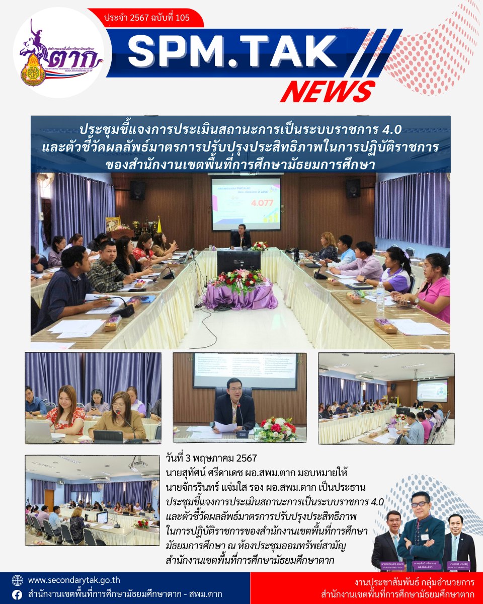 วันที่ 3 พฤษภาคม 2567 นายสุทัศน์ ศรีดาเดช ผอ.สพม.ตาก มอบหมายให้ นายจักรรินทร์ แจ่มใส รอง ผอ.สพม.ตาก เป็นประธาน ประชุมชี้แจงการประเมินสถานะการเป็นระบบราชการ 4.0 และตัวชี้วัดผลลัพธ์มาตรการปรับปรุงประสิทธิภาพในการปฏิบัติราชการของสำนักงานเขตพื้นที่การศึกษามัธยมการศึกษา ณ ห้องประชุมออมทรัพย์สามัญ สำนักงานเขตพื้นที่การศึกษามัธยมศึกษาตาก