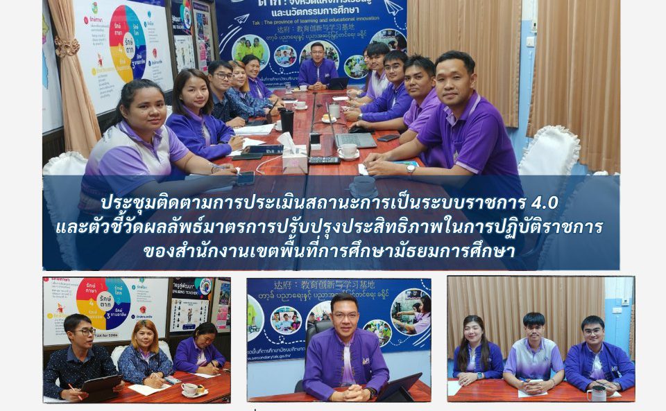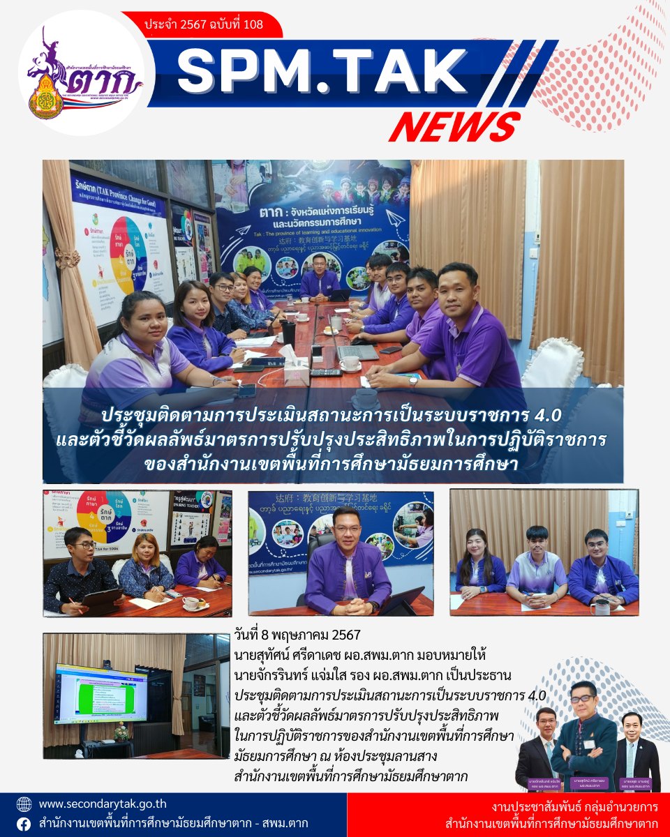 วันที่ 8 พฤษภาคม 2567 นายสุทัศน์ ศรีดาเดช ผอ.สพม.ตาก มอบหมายให้ นายจักรรินทร์ แจ่มใส รอง ผอ.สพม.ตาก เป็นประธานประชุมติดตามการประเมินสถานะการเป็นระบบราชการ 4.0 และตัวชี้วัดผลลัพธ์มาตรการปรับปรุงประสิทธิภาพในการปฏิบัติราชการของสำนักงานเขตพื้นที่การศึกษามัธยมการศึกษา ณ ห้องประชุมลานสาง สำนักงานเขตพื้นที่การศึกษามัธยมศึกษาตาก