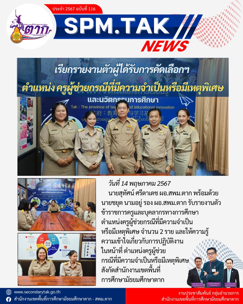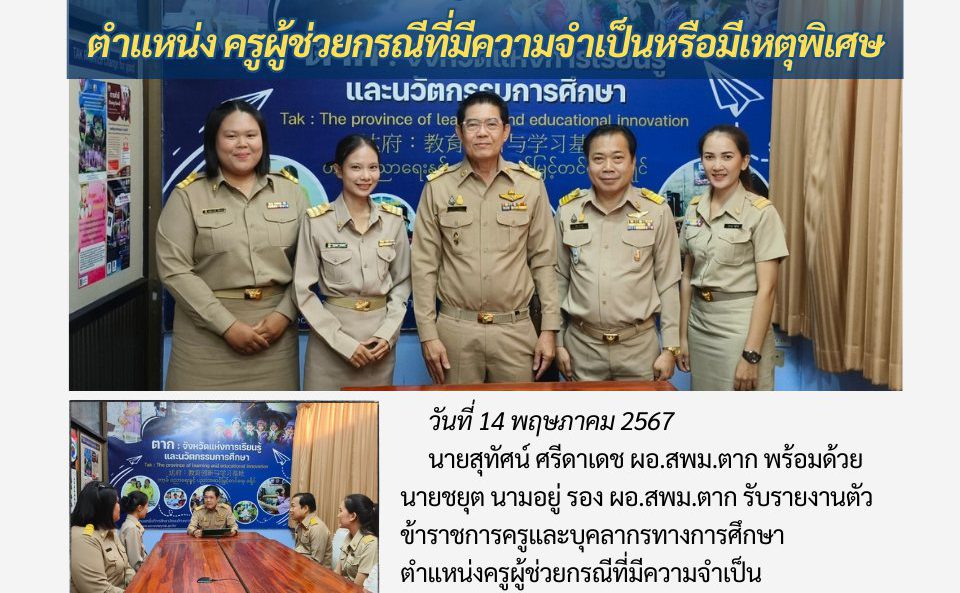 วันที่ 14 พฤษภาคม 2567 นายสุทัศน์ ศรีดาเดช ผอ.สพม.ตาก พร้อมด้วย นายชยุต นามอยู่ รอง ผอ.สพม.ตาก รับรายงานตัว ข้าราชการครูและบุคลากรทางการศึกษา ตำแหน่งครูผู้ช่วยกรณีที่มีความจำเป็น หรือมีเหตุพิเศษ จำนวน 2 ราย และให้ความรู้ความเข้าใจเกี่ยวกับการปฏิบัติงานในหน้าที่ ตำแหน่งครูผู้ช่วยกรณีที่มีความจำเป็นหรือมีเหตุพิเศษสังกัดสำนักงานเขตพื้นที่การศึกษามัธยมศึกษาตาก