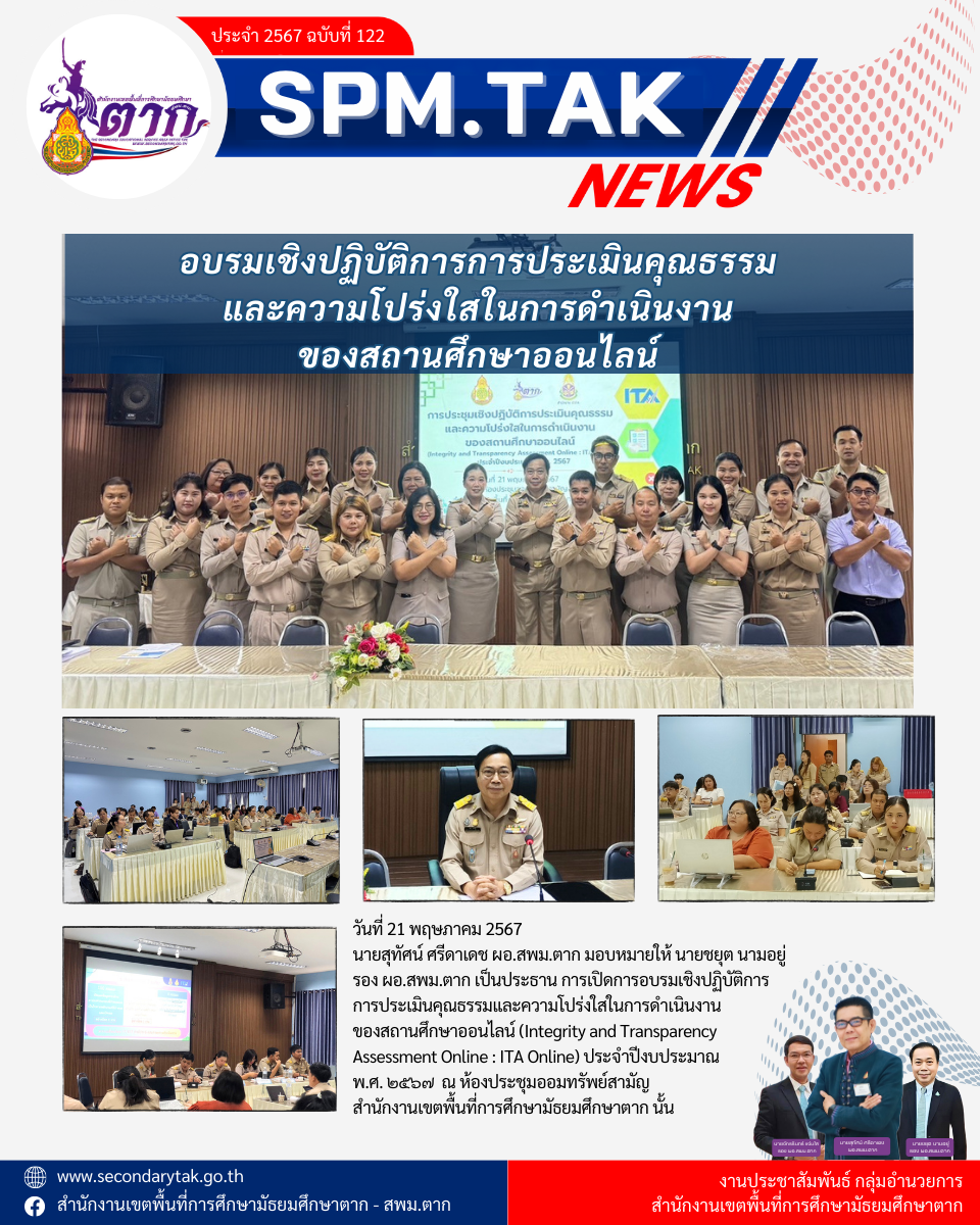 วันที่ 21 พฤษภาคม 2567 นายสุทัศน์ ศรีดาเดช ผอ.สพม.ตาก มอบหมายให้ นายชยุต นามอยู่ รอง ผอ.สพม.ตาก เป็นประธาน การเปิดการอบรมเชิงปฏิบัติการการประเมินคุณธรรมและความโปร่งใสในการดำเนินงานของสถานศึกษาออนไลน์ (Integrity and Transparency Assessment Online : ITA Online) ประจำปีงบประมาณ พ.ศ. ๒๕๖๗ ณ ห้องประชุมออมทรัพย์สามัญ สำนักงานเขตพื้นที่การศึกษามัธยมศึกษาตาก นั้น