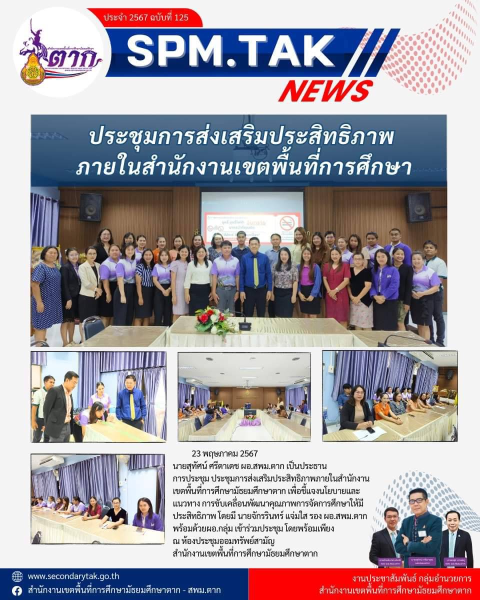 23 พฤษภาคม 2567 นายสุทัศน์ ศรีดาเดช ผอ.สพม.ตาก เป็นประธาน การประชุม ประชุมการส่งเสริมประสิทธิภาพภายในสำนักงานเขตพื้นที่การศึกษามัธยมศึกษาตาก เพื่อชี้แจงนโยบายและแนวทาง การขับเคลื่อนพัฒนาคุณภาพการจัดการศึกษาให้มีประสิทธิภาพ โดยมี นายจักรรินทร์ แจ่มใส รอง ผอ.สพม.ตาก พร้อมด้วยผอ.กลุ่ม เข้าร่วมประชุม โดยพร้อมเพียง ณ ห้องประชุมออมทรัพย์สามัญ สำนักงานเขตพื้นที่การศึกษามัธยมศึกษาตาก