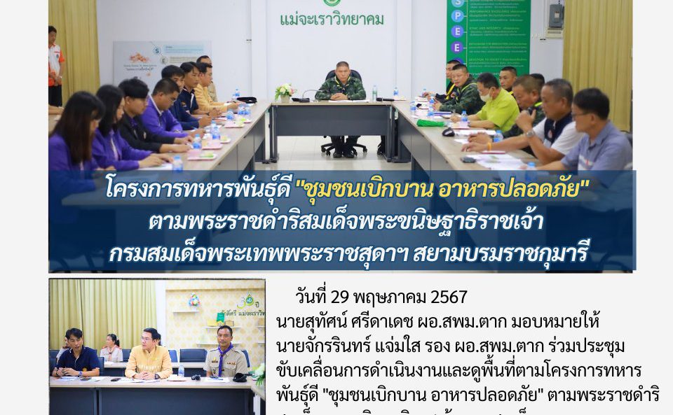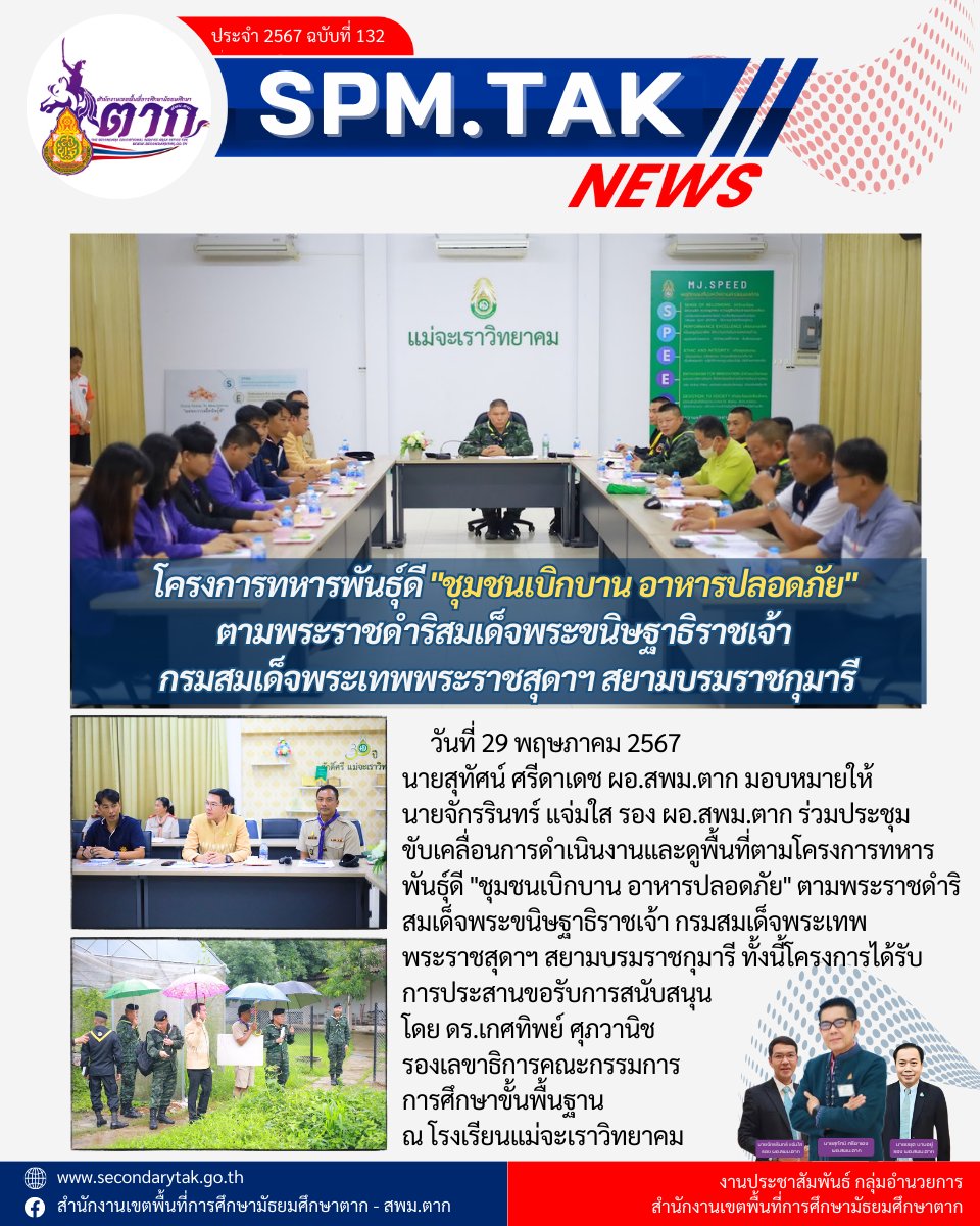 วันที่ 29 พฤษภาคม 2567 นายสุทัศน์ ศรีดาเดช ผอ.สพม.ตาก มอบหมายให้ นายจักรรินทร์ แจ่มใส รอง ผอ.สพม.ตาก ร่วมประชุมขับเคลื่อนการดำเนินงานและดูพื้นที่ตามโครงการทหารพันธุ์ดี “ชุมชนเบิกบาน อาหารปลอดภัย” ตามพระราชดำริสมเด็จพระขนิษฐาธิราชเจ้า กรมสมเด็จพระเทพพระราชสุดาฯ สยามบรมราชกุมารี ทั้งนี้โครงการได้รับการประสานขอรับการสนับสนุน โดย ดร.เกศทิพย์ ศุภวานิช รองเลขาธิการคณะกรรมการการศึกษาขั้นพื้นฐาน ณ โรงเรียนแม่จะเราวิทยาคม