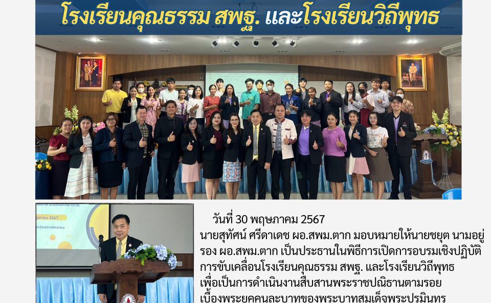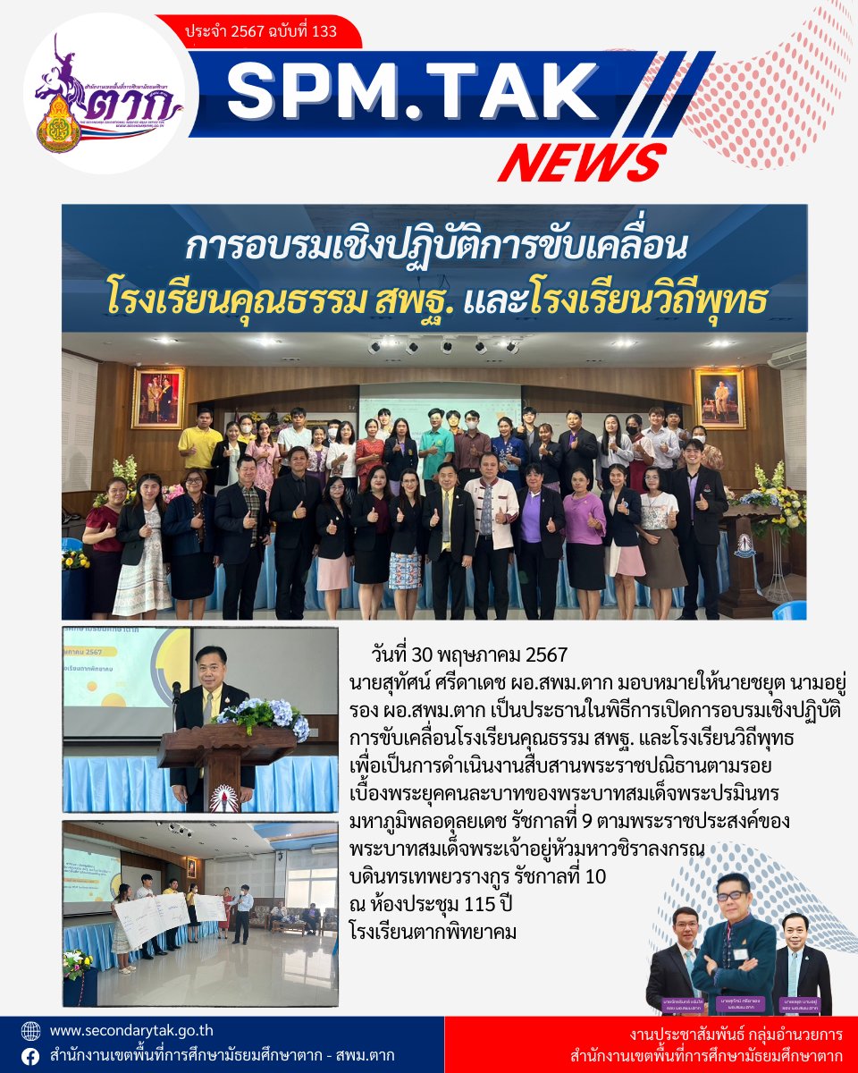 วันที่ 30 พฤษภาคม 2567 นายสุทัศน์ ศรีดาเดช ผอ.สพม.ตาก มอบหมายให้นายชยุต นามอยู่ รอง ผอ.สพม.ตาก เป็นประธานในพิธีการเปิดการอบรมเชิงปฏิบัติการขับเคลื่อนโรงเรียนคุณธรรม สพฐ. และโรงเรียนวิถีพุทธเพื่อเป็นการดำเนินงานสืบสานพระราชปณิธานตามรอยเบื้องพระยุคคนละบาทของพระบาทสมเด็จพระปรมินทรมหาภูมิพลอดุลยเดช รัชกาลที่ 9 ตามพระราชประสงค์ของพระบาทสมเด็จพระเจ้าอยู่หัวมหาวชิราลงกรณบดินทรเทพยวรางกูร รัชกาลที่ 10 ณ ห้องประชุม 115 ปี โรงเรียนตากพิทยาคม