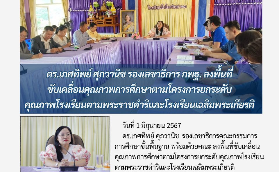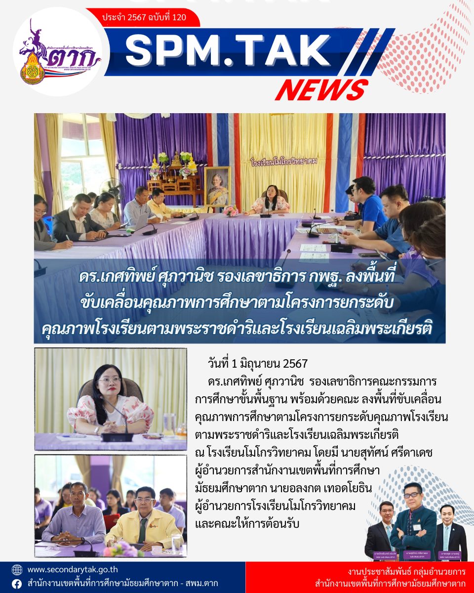 วันที่ 1 มิถุนายน 2567 ดร.เกศทิพย์ ศุภวานิช รองเลขาธิการคณะกรรมการการศึกษาขั้นพื้นฐาน พร้อมด้วยคณะ ลงพื้นที่ขับเคลื่อนคุณภาพการศึกษาตามโครงการยกระดับคุณภาพโรงเรียนตามพระราชดำริและโรงเรียนเฉลิมพระเกียรติ ณ โรงเรียนโมโกรวิทยาคม โดยมี นายสุทัศน์ ศรีดาเดช ผู้อำนวยการสำนักงานเขตพื้นที่การศึกษามัธยมศึกษาตาก นายอลงกต เทอดโยธิน ผู้อำนวยการโรงเรียนโมโกรวิทยาคม และคณะให้การต้อนรับ
