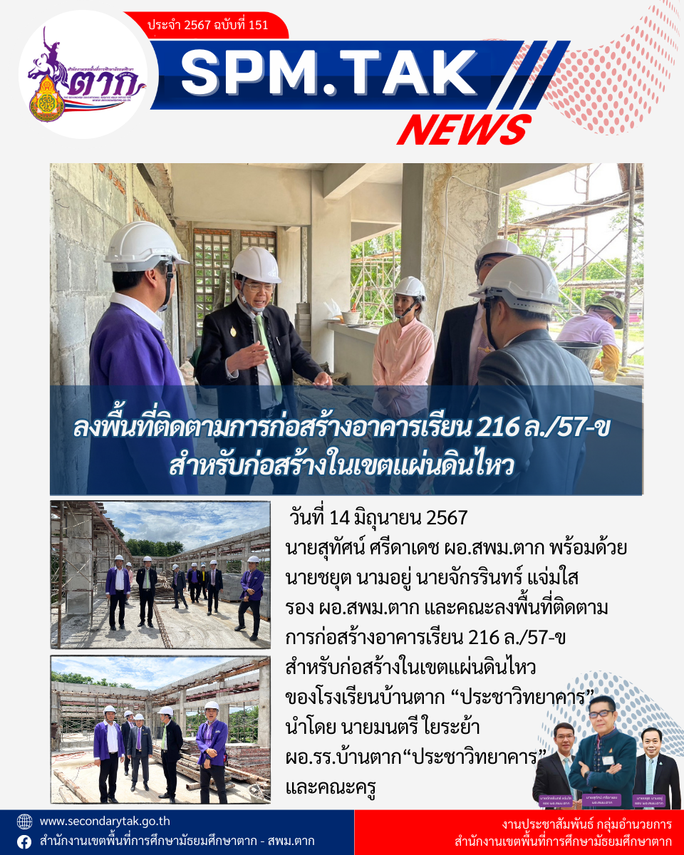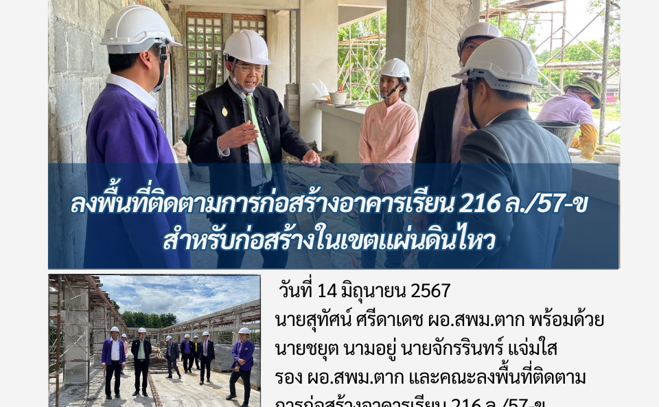 วันที่ 14 มิถุนายน 2567 นายสุทัศน์ ศรีดาเดช ผอ.สพม.ตาก พร้อมด้วย นายชยุต นามอยู่ นายจักรรินทร์ แจ่มใส รอง ผอ.สพม.ตาก และคณะ ลงพื้นที่ติดตาม การก่อสร้างอาคารเรียน 216 ล./57-ข สำหรับก่อสร้างในเขตแผ่นดินไหว ของโรงเรียนบ้านตาก “ประชาวิทยาคาร” นำโดย นายมนตรี ใยระย้า ผอ.รร.บ้านตาก“ประชาวิทยาคาร” และคณะครู