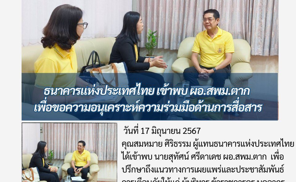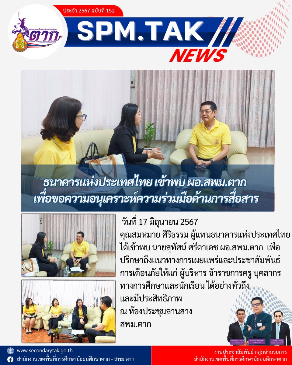 วันที่ 17 มิถุนายน 2567 คุณสมหมาย ศิริธรรม ผู้แทนธนาคารแห่งประเทศไทย ได้เข้าพบ นายสุทัศน์ ศรีดาเดช ผอ.สพม.ตาก เพื่อปรึกษาถึงแนวทางการเผยแพร่และประชาสัมพันธ์การเตือนภัยให้แก่ ผู้บริหาร ข้าราชการครู บุคลากรทางการศึกษาและนักเรียน ได้อย่างทั่วถึงและมีประสิทธิภาพ ณ ห้องประชุมลานสาง