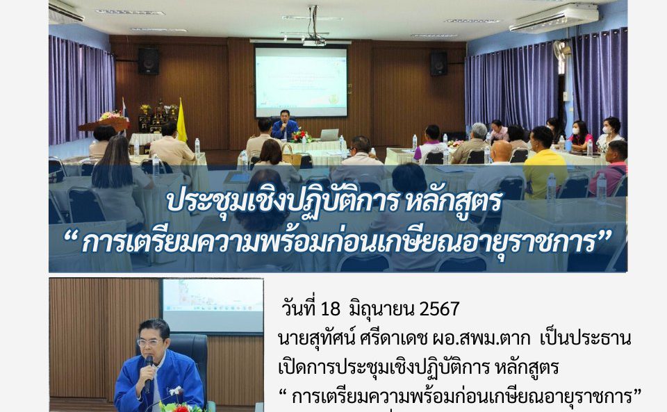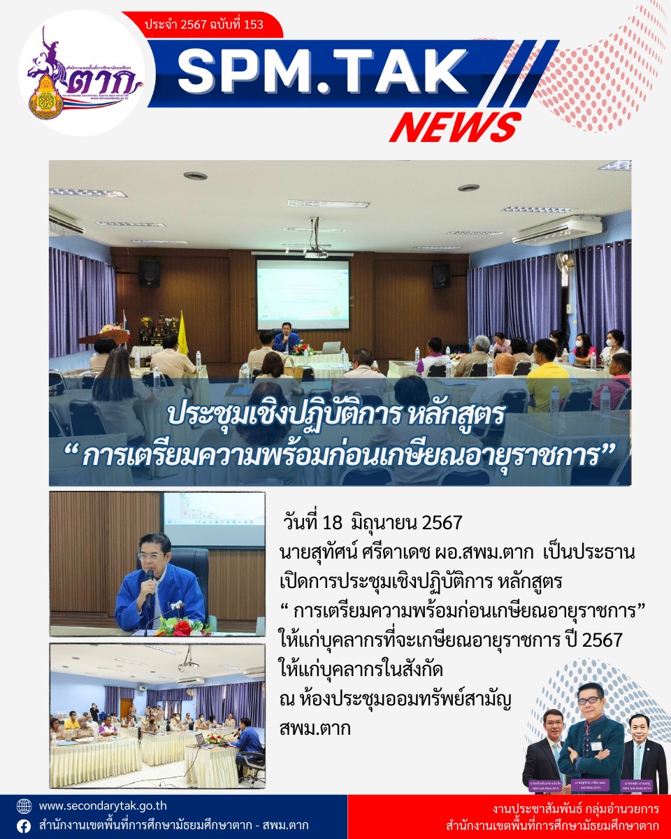 ประชุมเชิงปฏิบัติการ หลักสูตร “ การเตรียมความพร้อมก่อนเกษียณ วรวุฒิ เนื้อนิ่ม 18 มิถุนายน 2567 วันที่ 18 มิถุนายน 2567 นายสุทัศน์ ศรีดาเดช ผอ.สพม.ตาก เป็นประธานเปิดการประชุมเชิงปฏิบัติการ หลักสูตร “ การเตรียมความพร้อมก่อนเกษียณอายุราชการ”ให้แก่บุคลากรที่จะเกษียณอายุราชการ ปี 2567 ณ ห้องประชุมออมทรัพย์สามัญ สพม.ตาก จำนวนคนดู 25