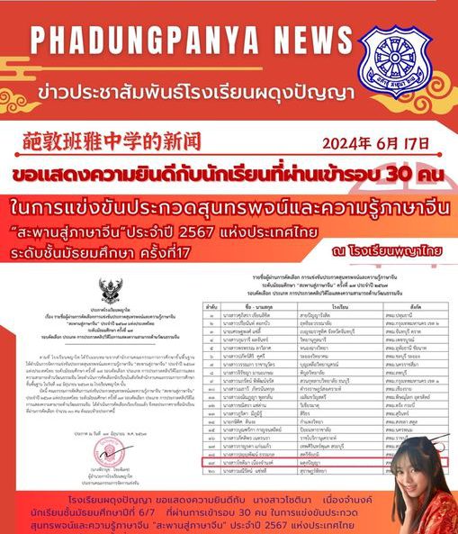 โรงเรียนผดุงปัญญา ขอแสดงความยินดีกับ นางสาวโชติมา เนื่องจำนงค์ นักเรียนชั้นมัธยมศึกษาปีที่ 6/7 ที่ผ่านการเข้ารอบ 30 คน ในการแข่งขันประกวดสุนทรพจน์และความรู้ภาษาจีน “สะพานสู่ภาษาจีน” ประจำปี 2567 แห่งประเทศไทย ระดับมัธยมศึกษา ครั้งที่ 17 ประเภท การประกวดคลิปวิดีโอการแสดงความสามารถด้านวัฒนธรรมจีน เมื่อวันที่ 14 มิถุนายน 2567 ณ โรงเรียนพญาไทย