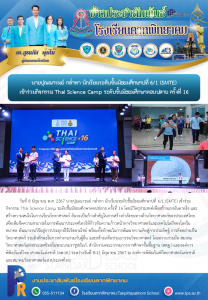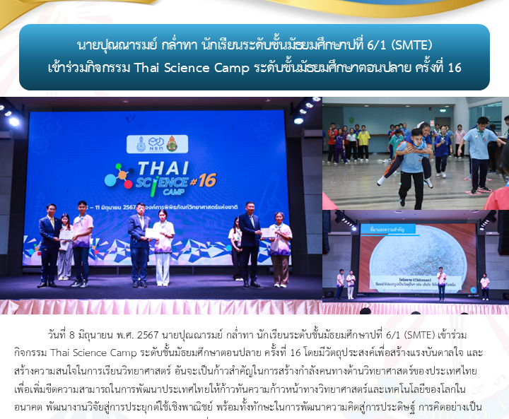 วันที่ 8 มิถุนายน พ.ศ. 2567 นายปุณณารมย์ กล่ำทา นักเรียนระดับชั้นมัธยมศึกษาปที่ 6/1 (SMTE) เข้าร่วมกิจกรรม Thai Science Camp ระดับชั้นมัธยมศึกษาตอนปลาย ครั้งที่ 16 โดยมีวัตถุประสงค์เพื่อสร้างแรงบันดาลใจ และสร้างความสนใจในการเรียนวิทยาศาสตร์ อันจะเป็นก้าวสำคัญในการสร้างกำลังคนทางด้านวิทยาศาสตร์ของประเทศไทย เพื่อเพิ่มขีดความสามารถในการพัฒนาประเทศไทยให้ก้าวทันความก้าวหน้าทางวิทยาศาสตร์และเทคโนโลยีของโลกในอนาคต พัฒนางานวิจัยสู่การประยุกต์ใช้เชิงพาณิชย์ พร้อมทั้งทักษะในการพัฒนาความคิดสู่การประดิษฐ์ การคิดอย่างเป็นวิทยาศาสตร์ รวมถึงทักษะในการทำงานร่วมกับผู้อื่น และสร้างเครือข่ายเยาวชนวิทยาศาสตร์ โดยความร่วมมือ สมาคมวิทยาศาสตร์แห่งประเทศไทยในพระบรมราชูปถัมภ์, สำนักงานคณะกรรมการการศึกษาขั้นพื้นฐาน (สพฐ.) และองค์การพิพิธภัณฑ์วิทยาศาสตร์แห่งชาติ (อพวช.) ระหว่างวันที่ 8-11 มิถุนายน 2567 ณ องค์การพิพิธภัณฑ์วิทยาศาสตร์แห่งชาติ และสมาคมวิทยาศาสตร์แห่งประเทศไทย