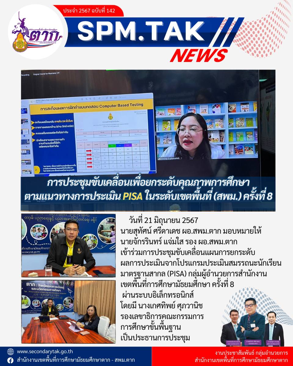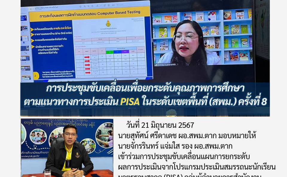 วันที่ 21 มิถุนายน 2567 นายสุทัศน์ ศรีดาเดช ผอ.สพม.ตาก มอบหมายให้ นายจักรรินทร์ แจ่มใส รอง ผอ.สพม.ตาก เข้าร่วมการประชุมขับเคลื่อนแผนการยกระดับผลการประเมินจากโปรแกรมประเมินสมรรถนะนักเรียนมาตรฐานสากล (PISA) กลุ่มผู้อำนวยการสำนักงานเขตพื้นที่การศึกษามัธยมศึกษา ครั้งที่ 8 ผ่านระบบอิเล็กทรอนิกส์ โดยมี นางเกศทิพย์ ศุภวานิชรองเลขาธิการคณะกรรมการการศึกษาขั้นพื้นฐาน เป็นประธานการประชุม