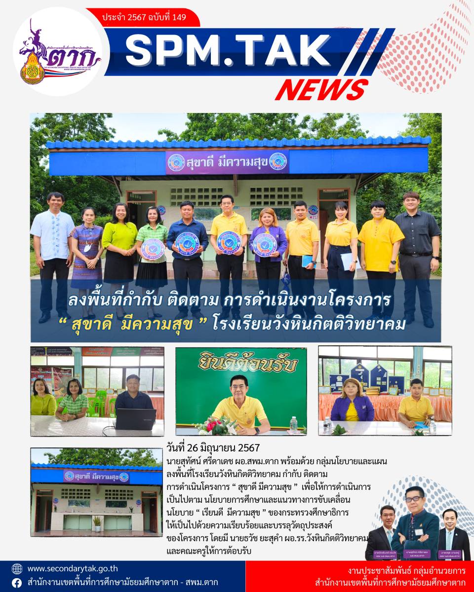 วันที่ 26 มิถุนายน 2567 นายสุทัศน์ ศรีดาเดช ผอ.สพม.ตาก พร้อมด้วย กลุ่มนโยบายและแผน ลงพื้นที่โรงเรียนวังหินกิตติวิทยาคม กำกับ ติดตาม การดำเนินโครงการ “ สุขาดี มีความสุข ” เพื่อให้การดำเนินการ เป็นไปตาม นโยบายการศึกษาและแนวทางการขับเคลื่อน นโยบาย “ เรียนดี มีความสุข ” ของกระทรวงศึกษาธิการ ให้เป็นไปด้วยความเรียบร้อยและบรรลุวัตถุประสงค์ ของโครงการ โดยมี นายธวัช ยะสุคำ ผอ.รร.วังหินกิตติวิทยาคม และคณะครูให้การต้อบรับ