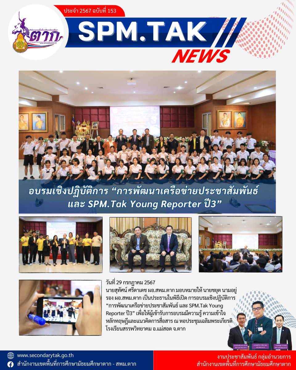 วันที่ 29 กรกฎาคม 2567 นายสุทัศน์ ศรีดาเดช ผอ.สพม.ตาก มอบหมายให้ นายชยุต นามอยู่ รอง ผอ.สพม.ตาก เป็นประธานในพิธีเปิด การอบรมเชิงปฏิบัติการ “การพัฒนาเครือข่ายประชาสัมพันธ์ และ SPM.Tak Young Reporter ปี3” เพื่อให้ผู้เข้ารับการอบรมมีความรู้ ความเข้าใจ หลักทฤษฎีและแนวคิดการสื่อสาร ณ หอประชุมเฉลิมพระเกียรติ โรงเรียนสรรพวิทยาคม อ.แม่สอด จ.ตาก