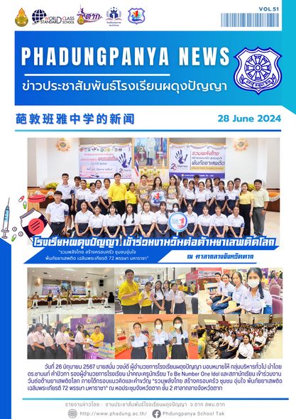 วันที่ 26 มิถุนายน 2567 นายสนั่น วงษ์ดี ผู้อำนวยการโรงเรียนผดุงปัญญา มอบหมายให้ กลุ่มบริหารทั่วไปนำโดยดร.ชานนท์ คำปิวทา รองผู้อำนวยการโรงเรียน นำคณะครูนักเรียน To Be Number One Idol และสภานักเรียน เข้าร่วมงานวันต่อต้านยาเสพติดโลก ภายใต้กรอบแนวคิดและคำขวัญ “รวมพลังไทย สร้างครอบครัว ชุมชน อุ่นใจ พ้นภัยยาเสพติด เฉลิมพระเกียรติ 72 พรรษา มหาราชา” ณ หอประชุมจังหวัดตาก ชั้น 2 ศาลากลางจังหวัดตาก