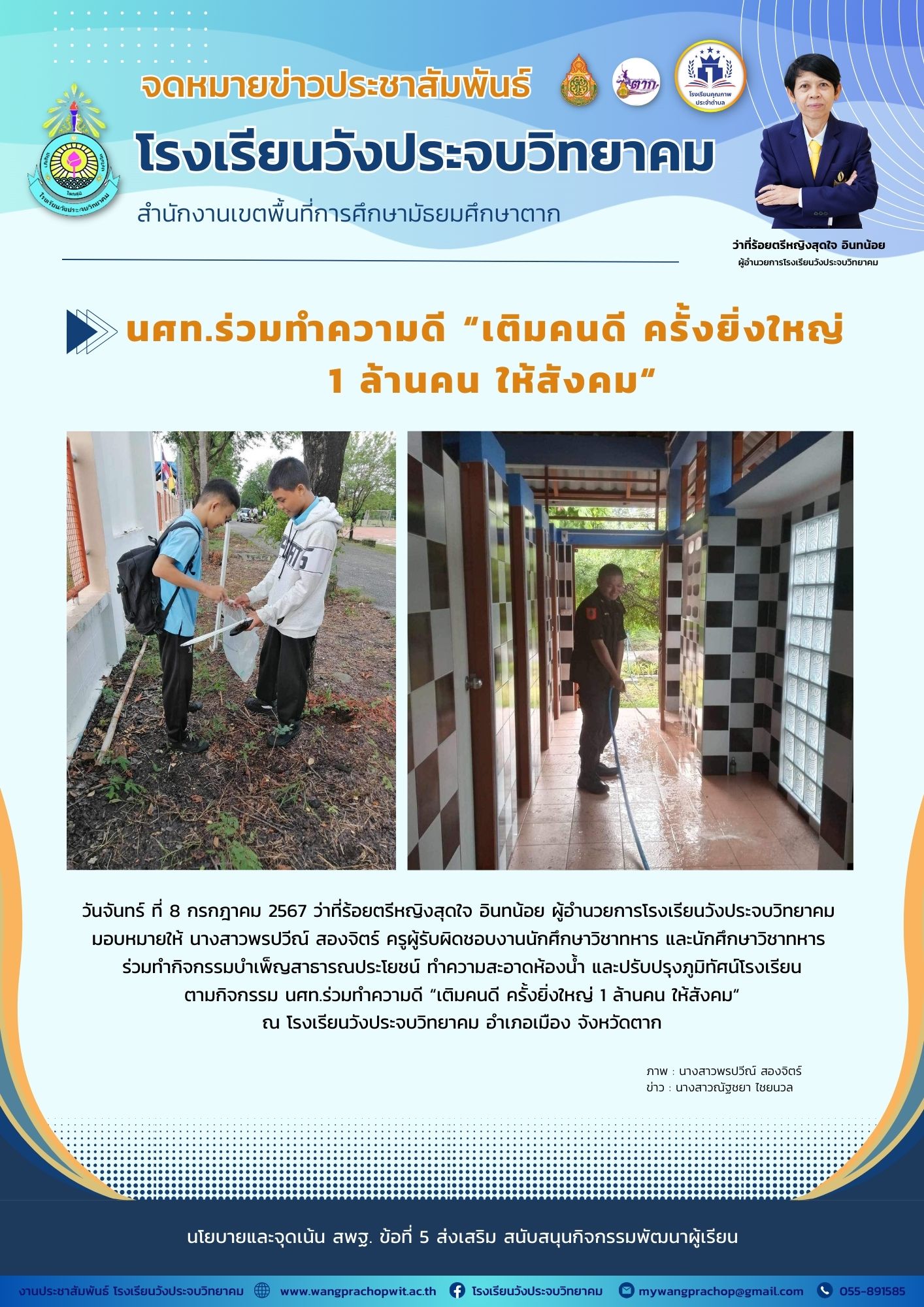 วันจันทร์ ที่ 8 กรกฎาคม 2567 ว่าที่ร้อยตรีหญิงสุดใจ อินทน้อย ผู้อำนวยการโรงเรียนวังประจบวิทยาคม มอบหมายให้ นางสาวพรปวีณ์ สองจิตร์ ครูผู้รับผิดชอบงานนักศึกษาวิชาทหาร และนักศึกษาวิชาทหาร ร่วมทำกิจกรรมบำเพ็ญสาธารณประโยชน์ ทำความสะอาดห้องน้ำ และปรับปรุงภูมิทัศน์โรงเรียนตามกิจกรรม นศท.ร่วมทำความดี “เติมคนดี ครั้งยิ่งใหญ่ 1 ล้านคน ให้สังคม“ ณ โรงเรียนวังประจบวิทยาคม อำเภอเมือง จังหวัดตาก