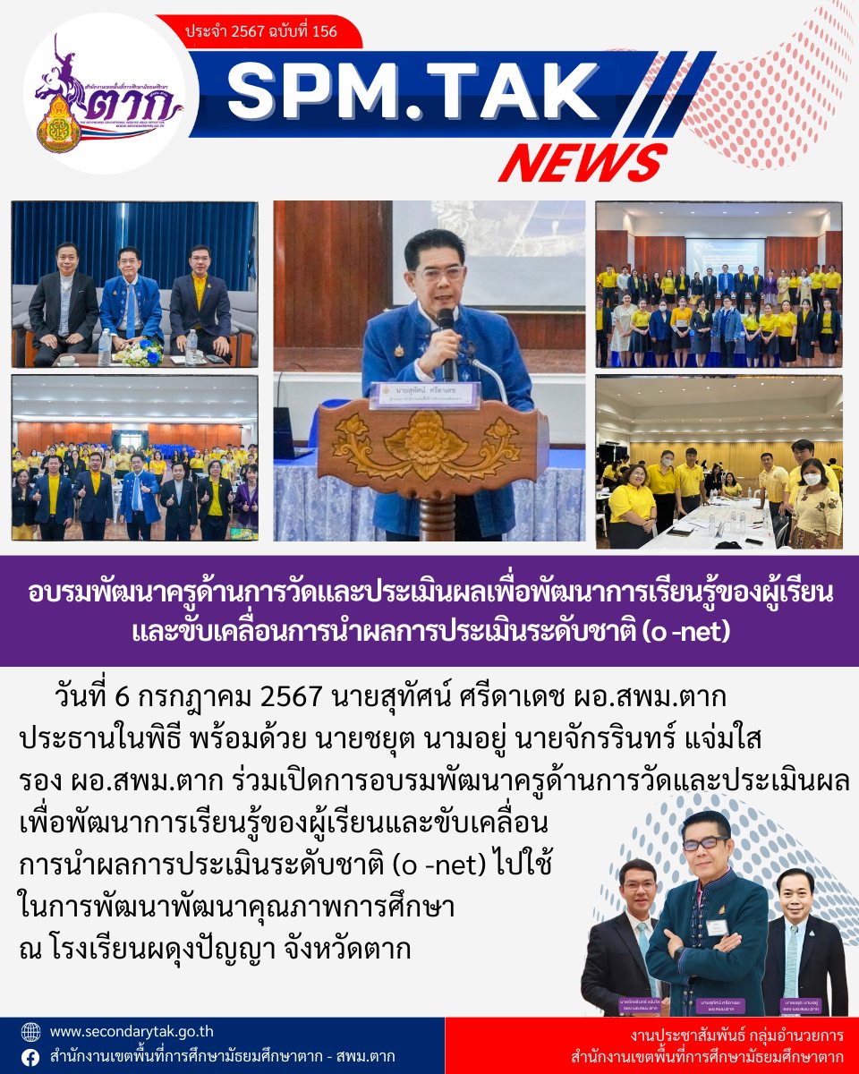 วันที่ 6 กรกฎาคม 2567 นายสุทัศน์ ศรีดาเดช ผอ.สพม.ตาก ประธานในพิธี พร้อมด้วย นายชยุต นามอยู่ นายจักรรินทร์ แจ่มใส รอง ผอ.สพม.ตาก ร่วมเปิดการอบรมพัฒนาครูด้านการวัดและประเมินผล เพื่อพัฒนาการเรียนรู้ของผู้เรียนและขับเคลื่อน การนำผลการประเมินระดับชาติ (o -net) ไปใช้ ในการพัฒนาพัฒนาคุณภาพการศึกษา ณ โรงเรียนผดุงปัญญา จังหวัดตาก