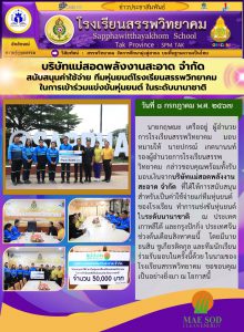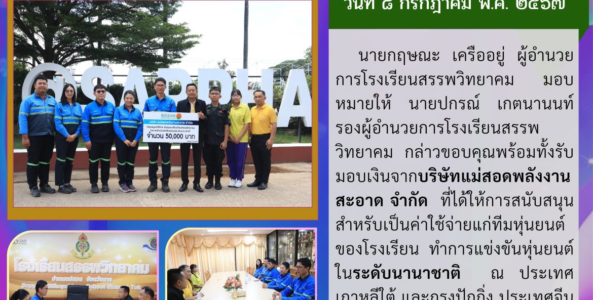 โรงเรียนสรรพวิทยาคม : รับ มอบเงินจากบริษัทแม่สอดพลังงานสะอาด จำกัด ที่ได้ให้การสนับสนุนสำหรับเป็นค่าใช้จ่ายแก่ทีมหุ่นยนต์ของโรงเรียน ทำการแข่งขันหุ่นยนต์ในระดับนานาชาติ ณ ประเทศเกาหลีใต้ และกรุงปักกิ่ง ประเทศจีน นิรมล พิพัฒน์คุปติกุล 12 กรกฎาคม 2567 จำนวนคนดู 1