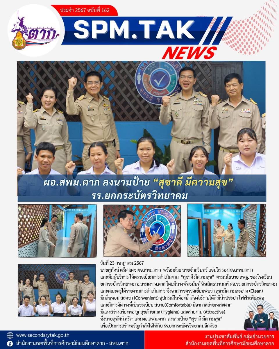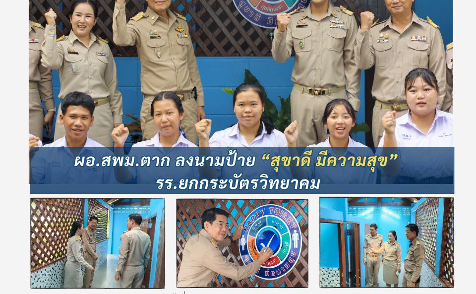 วันที่ 23 กรกฎาคม 2567 นายสุทัศน์ ศรีดาเดช ผอ.สพม.ตาก พร้อมด้วย นายจักกรินทร์ แจ่มใส รอง ผอ.สพม.ตาก และทีมผู้บริหาร ได้ตรวจเยี่ยมการดำเนินงาน “สุขาดี มีความสุข” ตามนโยบาย สพฐ. ของโรงเรียนยกกระบัตรวิทยาคม อ.สามเงา จ.ตาก โดยมีนางพัทธนันท์ จิรเลิศธนานนท์ ผอ.รร.ยกกระบัตรวิทยาคม และคณะครูได้รายงานการดำเนินการ ซึ่งจากการตรวจเยี่ยมพบว่า สุขามีความสะอาด (Clean) มีกลิ่นหอม สะดวก (Convenient) อุปกรณ์ในห้องน้ำต้องใช้งานได้ดี มีน้ำประปา ไฟฟ้าเพียงพอ และมีการจัดวางที่เป็นระเบียบ สบาย (Comfortable) มีอากาศถ่ายเทสะดวก มีแสงสว่างเพียงพอ ถูกสุขลักษณะ (Hygiene) และสวยงาม (Attractive) ซึ่งนายสุทัศน์ ศรีดาเดช ผอ.สพม.ตาก ลงนามป้าย “สุขาดี มีความสุข” เพื่อเป็นการสร้างขวัญกำลังใจให้กับ รร.ยกกระบัตรวิทยาคมอีกด้วย