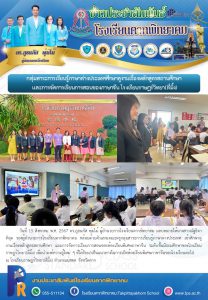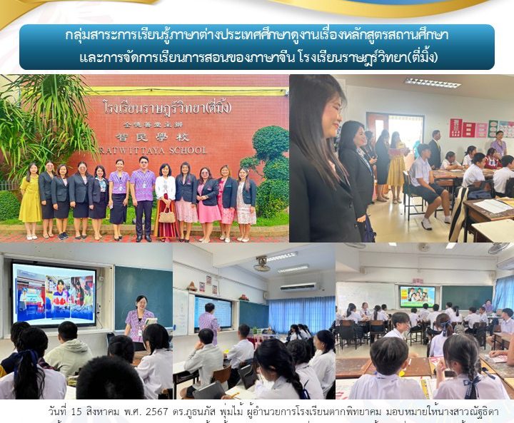 วันที่ 15 สิงหาคม พ.ศ. 2567 ดร.ภูธนภัส พุ่มไม้ ผู้อำนวยการโรงเรียนตากพิทยาคม มอบหมายให้นางสาวณัฐธิดา ทิอุด รองผู้อำนวยการโรงเรียนตากพิทยาคม พร้อมด้วยตัวแทนคณะครูกลุ่มสาระการเรียนรู้ภาษาต่างประเทศ เข้าศึกษาดูงานเรื่องหลักสูตรสถานศึกษา และการจัดการเรียนการสอนของห้องเรียนพิเศษภาษาจีน ระดับชั้นมัธยมศึกษาของโรงเรียนราษฎร์วิทยา(ตี่มิ้ง) เพื่อนำองค์ความรู้ใหม่ ๆ ที่ได้รับมาเป็นแนวทางในการเปิดห้องเรียนพิเศษภาษาจีนของโรงเรียนต่อไป ณ โรงเรียนราษฎร์วิทยา(ตี่มิ้ง) อำเภอแม่สอด จังหวัดตาก