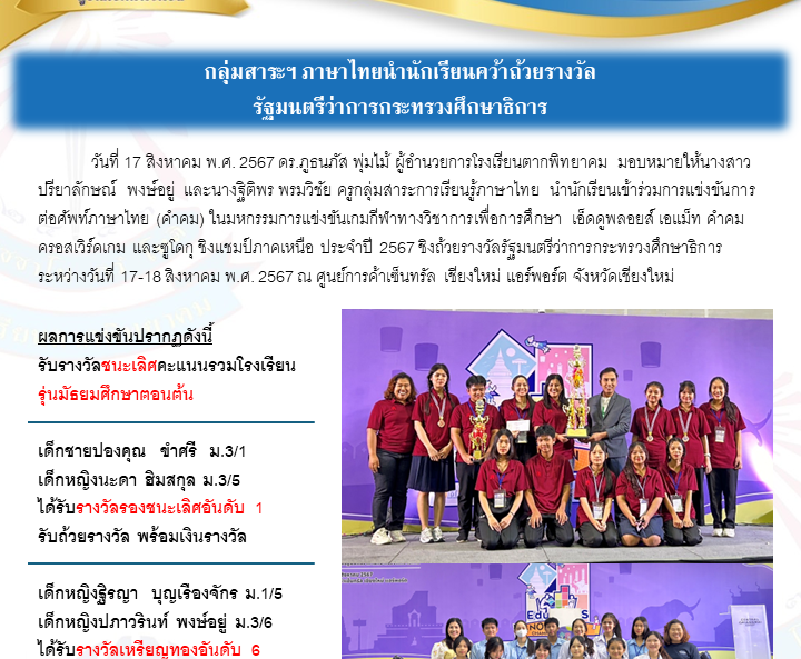 วันที่ 17 สิงหาคม พ.ศ. 2567 ดร.ภูธนภัส พุ่มไม้ ผู้อำนวยการโรงเรียนตากพิทยาคม มอบหมายให้นางสาวปรียาลักษณ์ พงษ์อยู่ และนางฐิติพร พรมวิชัย ครูกลุ่มสาระการเรียนรู้ภาษาไทย นำนักเรียนเข้าร่วมการแข่งขันการต่อศัพท์ภาษาไทย (คำคม) ในมหกรรมการแข่งขันเกมกีฬาทางวิชาการเพื่อการศึกษา เอ็ดดูพลอยส์ เอแม็ท คำคม ครอสเวิร์ดเกม และซูโดกุ ชิงแชมป์ภาคเหนือ ประจำปี 2567 ชิงถ้วยรางวัลรัฐมนตรีว่าการกระทรวงศึกษาธิการ ระหว่างวันที่ 17-18 สิงหาคม พ.ศ. 2567 ณ ศูนย์การค้าเซ็นทรัล เชียงใหม่ แอร์พอร์ต จังหวัดเชียงใหม่