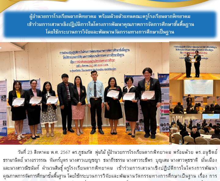 วันที่ 23 สิงหาคม พ.ศ. 2567 ดร.ภูธนภัส พุ่มไม้ ผู้อำนวยการโรงเรียนตากพิทยาคม พร้อมด้วย ดร.อนุชิตย์ ธรามานิตย์ นางอรวรรณ จันทร์บุตร นางสาวเบญชญา ธนาถิรธรรม นางสาวระธีพร บุญเสม นางสาวพุธชาติ มั่นเมือง และนางสาวณิชนันท์ คำนวนสินธุ์ ครูโรงเรียนตากพิทยาคม เข้าร่วมการเสวนาเชิงปฏิบัติการในโครงการพัฒนาคุณภาพการจัดการศึกษาขั้นพื้นฐาน โดยใช้กระบวนการวิจัยและพัฒนานวัตกรรมทางการศึกษาเป็นฐาน เรื่อง การนำเสนอและเผยแพร่นวัตกรรมทางการศึกษา ซึ่ง ดร.อนุชิต ธรามานิตย์ ได้รับการคัดเลือกเป็นตัวแทนจากศูนย์จังหวัดตาก ในการนำเสนอผลงาน เรื่อง การพัฒนาชุดกิจกรรมการเรียนรู้ทักษะการเขียนภาษาอังกฤษโดยวิธีการสอนภาษาที่เน้นภาระงานร่วมกับดิคโทกลอสเป็นฐาน (Task with Dictogloss-Based Language Teaching: TDBLT) วิชาภาษาอังกฤษพื้นฐาน สำหรับนักเรียนชั้นมัธยมศึกษาปีที่ 6 ณ โรงแรมเดอะพาร์ค อำเภอเมืองพิษณุโลก จังหวัดพิษณุโลก