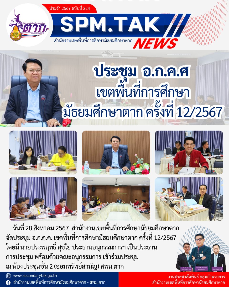 วันที่ 28 สิงหาคม 2567 สำนักงานเขตพื้นที่การศึกษามัธยมศึกษาตากจัดประชุม อ.ก.ค.ศ. เขตพื้นที่การศึกษามัธยมศึกษาตาก ครั้งที่ 12/2567 โดยมี นายประพฤทธิ์ สุขใย ประธานอนุกรรมการฯ เป็นประธาน การประชุม พร้อมด้วยคณะอนุกรรมการ เข้าร่วมประชุม ณ ห้องประชุมชั้น 2 (ออมทรัพย์สามัญ) สพม.ตาก