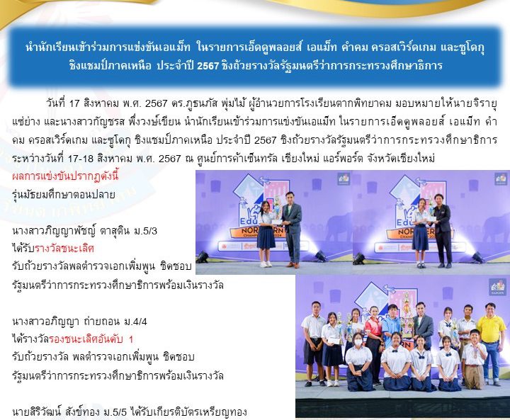 วันที่ 17 สิงหาคม พ.ศ. 2567 ดร.ภูธนภัส พุ่มไม้ ผู้อำนวยการโรงเรียนตากพิทยาคม มอบหมายให้นายจิรายุ แซ่ย่าง และนางสาวกัญชรส พึ่งวงษ์เขียน นำนักเรียนเข้าร่วมการแข่งขันเอแม็ท ในรายการเอ็ดดูพลอยส์ เอแม็ท คำคม ครอสเวิร์ดเกม และซูโดกุ ชิงแชมป์ภาคเหนือ ประจำปี 2567 ชิงถ้วยรางวัลรัฐมนตรีว่าการกระทรวงศึกษาธิการ ระหว่างวันที่ 17-18 สิงหาคม พ.ศ. 2567 ณ ศูนย์การค้าเซ็นทรัล เชียงใหม่ แอร์พอร์ต จังหวัดเชียงใหม่