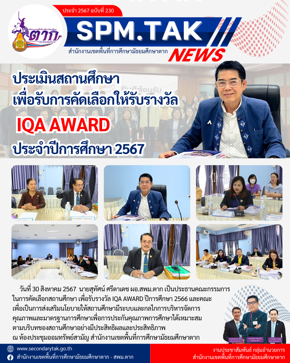 วันที่ 30 สิงหาคม 2567 นายสุทัศน์ ศรีดาเดช ผอ.สพม.ตาก เป็นประธานคณะกรรมการ ในการคัดเลือกสถานศึกษา เพื่อรับรางวัล IQA AWARD ปีการศึกษา 2566 และคณะ เพื่อเป็นการส่งเสริมนโยบายให้สถานศึกษามีระบบและกลไกการบริหารจัดการ คุณภาพและมาตรฐานการศึกษาเพื่อการประกันคุณภาพการศึกษาได้เหมาะสม ตามบริบทของสถานศึกษาอย่างมีประสิทธิผลและประสิทธิภาพ ณ ห้องประชุมออมทรัพย์สามัญ สำนักงานเขตพื้นที่การศึกษามัธยมศึกษาตาก