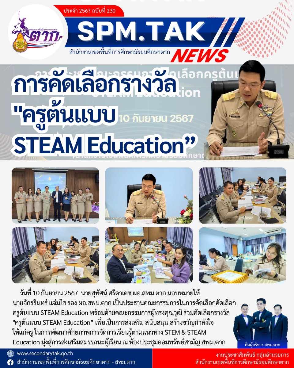 วันที่ 10 กันยายน 2567 นายสุทัศน์ ศรีดาเดช ผอ.สพม.ตาก มอบหมายให้ นายจักรรินทร์ แจ่มใส รอง ผอ.สพม.ตาก เป็นประธานคณะกรรมการในการคัดเลือกคัดเลือกครูต้นแบบ STEAM Education พร้อมด้วยคณะกรรมการผู้ทรงคุณวุฒิ ร่วมคัดเลือกรางวัล “ครูต้นแบบ STEAM Education” เพื่อเป็นการส่งเสริม สนับสนุน สร้างขวัญกำลังใจให้แก่ครู ในการพัฒนาศักยภาพการจัดการเรียนรู้ตามแนวทาง STEM & STEAM Education มุ่งสู่การส่งเสริมสมรรถนะผู้เรียน ณ ห้องประชุมออมทรัพย์สามัญ สพม.ตาก