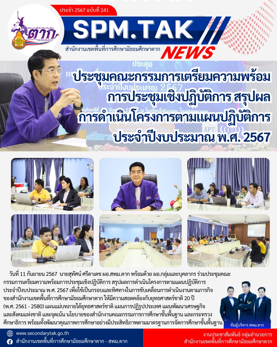วันที่ 11 กันยายน 2567 นายสุทัศน์ ศรีดาเดช ผอ.สพม.ตาก พร้อมด้วย ผอ.กลุ่มและบุคลากร ร่วมประชุมคณะกรรมการเตรียมความพร้อมการประชุมเชิงปฏิบัติการ สรุปผลการดำเนินโครงการตามแผนปฏิบัติการ ประจำปีงบประมาณ พ.ศ. 2567 เพื่อใช้เป็นกรอบและทิศทางในการขับเคลื่อนการดำเนินงานตามภารกิจ ของสำนักงานเขตพื้นที่การศึกษามัธยมศึกษาตาก ให้มีความสอดคล้องกับยุทธศาสตร์ชาติ 20 ปี (พ.ศ. 2561 – 2580) แผนแม่บทภายใต้ยุทธศาสตร์ชาติ แผนการปฏิรูปประเทศ แผนพัฒนาเศรษฐกิจ และสังคมแห่งชาติ และจุดเน้น นโยบายของสำนักงานคณะกรรมการการศึกษาขั้นพื้นฐาน และกระทรวง ศึกษาธิการ พร้อมทั้งพัฒนาคุณภาพการศึกษาอย่างมีประสิทธิภาพตามมาตรฐานการจัดการศึกษาขั้นพื้นฐาน