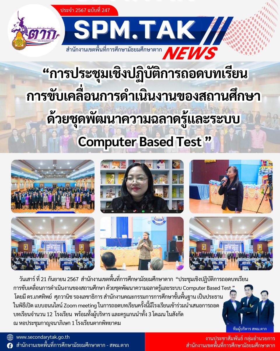 วันเสาร์ ที่ 21 กันยายน 2567 สำนักงานเขตพื้นที่การศึกษามัธยมศึกษาตาก “ประชุมเชิงปฏิบัติการถอดบทเรียน การขับเคลื่อนการดำเนินงานของสถานศึกษา ด้วยชุดพัฒนาความฉลาดรู้และระบบ Computer Based Test ” โดยมี ดร.เกศทิพย์ ศุภวานิช รองเลขาธิการ สำนักงานคณะกรรมการการศึกษาขั้นพื้นฐาน เป็นประธาน ในพิธีเปิด แบบอนนไลน์ Zoom meeting ในการถอดบทเรียนครั้งนี้มีโรงเรียนเข้าร่วมนำเสนอการถอด บทเรียนจำนวน 12 โรงเรียน พร้อมทั้งผู้บริหาร และครูแกนนำทั้ง 3 โดเมน ในสังกัด ณ หอประชุมกาญจนาภิเษก 1 โรงเรียนตากพิทยาคม
