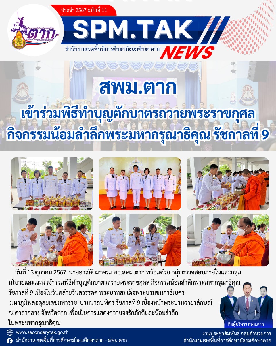 สพม.ตาก เข้าร่วมพิธีทำบุญตักบาตรถวายพระราชกุศล กิจกรรมน้อมลำลึกพระมหากรุณาธิคุณ รัชกาลที่ 9 วรวุฒิ เนื้อนิ่ม 16 ตุลาคม 2567 จำนวนคนดู 11