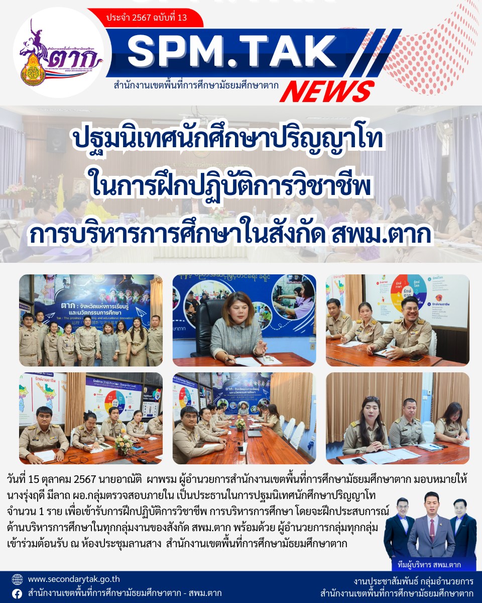 วันที่ 15 ตุลาคม 2567 นายอาณัติ ผาพรม ผู้อำนวยการสำนักงานเขตพื้นที่การศึกษามัธยมศึกษาตาก มอบหมายให้ นางรุ่งฤดี มีลาถ ผอ.กลุ่มตรวจสอบภายใน เป็นประธานในการปฐมนิเทศนักศึกษาปริญญาโท จำนวน 1 ราย เพื่อเข้ารับการฝึกปฏิบัติการวิชาชีพ การบริหารการศึกษา โดยจะฝึกประสบการณ์ ด้านบริหารการศึกษาในทุกกลุ่มงานของสังกัด สพม.ตาก พร้อมด้วย ผู้อำนวยการกลุ่มทุกกลุ่ม เข้าร่วมต้อนรับ ณ ห้องประชุมลานสาง สำนักงานเขตพื้นที่การศึกษามัธยมศึกษาตาก