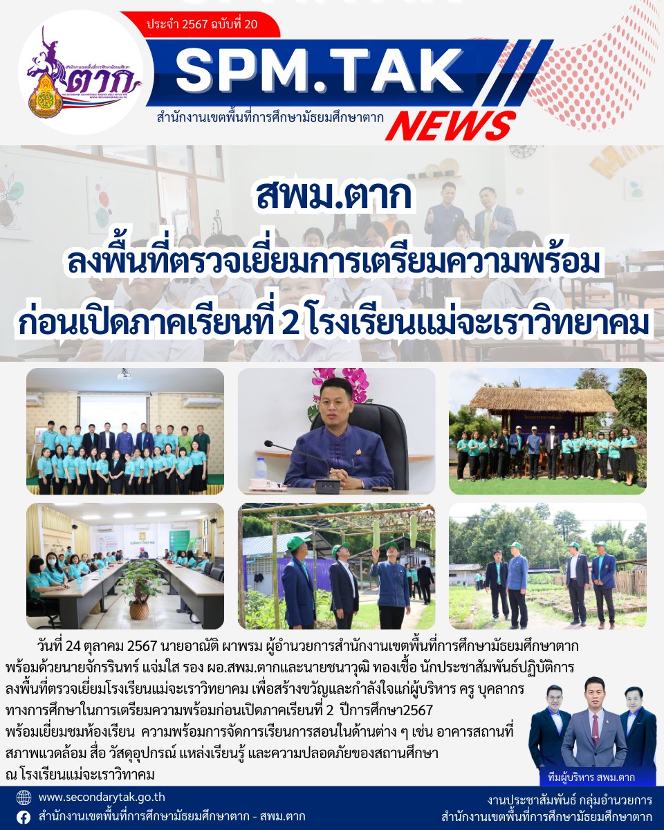 วันที่ 24 ตุลาคม 2567 นายอาณัติ ผาพรม ผู้อำนวยการสำนักงานเขตพื้นที่การศึกษามัธยมศึกษาตาก พร้อมด้วยนายจักรรินทร์ แจ่มใส รอง ผอ.สพม.ตากและนายชนาวุฒิ ทองเชื้อ นักประชาสัมพันธ์ปฏิบัติการ ลงพื้นที่ตรวจเยี่ยมโรงเรียนแม่จะเราวิทยาคม เพื่อสร้างขวัญและกำลังใจแก่ผู้บริหาร ครู บุคลากร ทางการศึกษาและนักเรียน เนื่องในวันแรกของการเปิดภาคเรียนที่ 2 ปีการศึกษา2567 พร้อมเยี่ยมชมห้องเรียน การจัดกิจกรรมการเรียนการสอน ความพร้อมการจัดการเรียนการสอน ในด้านต่าง ๆ เช่น อาคารสถานที่ สภาพแวดล้อม สื่อ วัสดุอุปกรณ์ แหล่งเรียนรู้ และความปลอดภัย ของสถานศึกษา ณ โรงเรียนแม่จะเราวิทยาคม