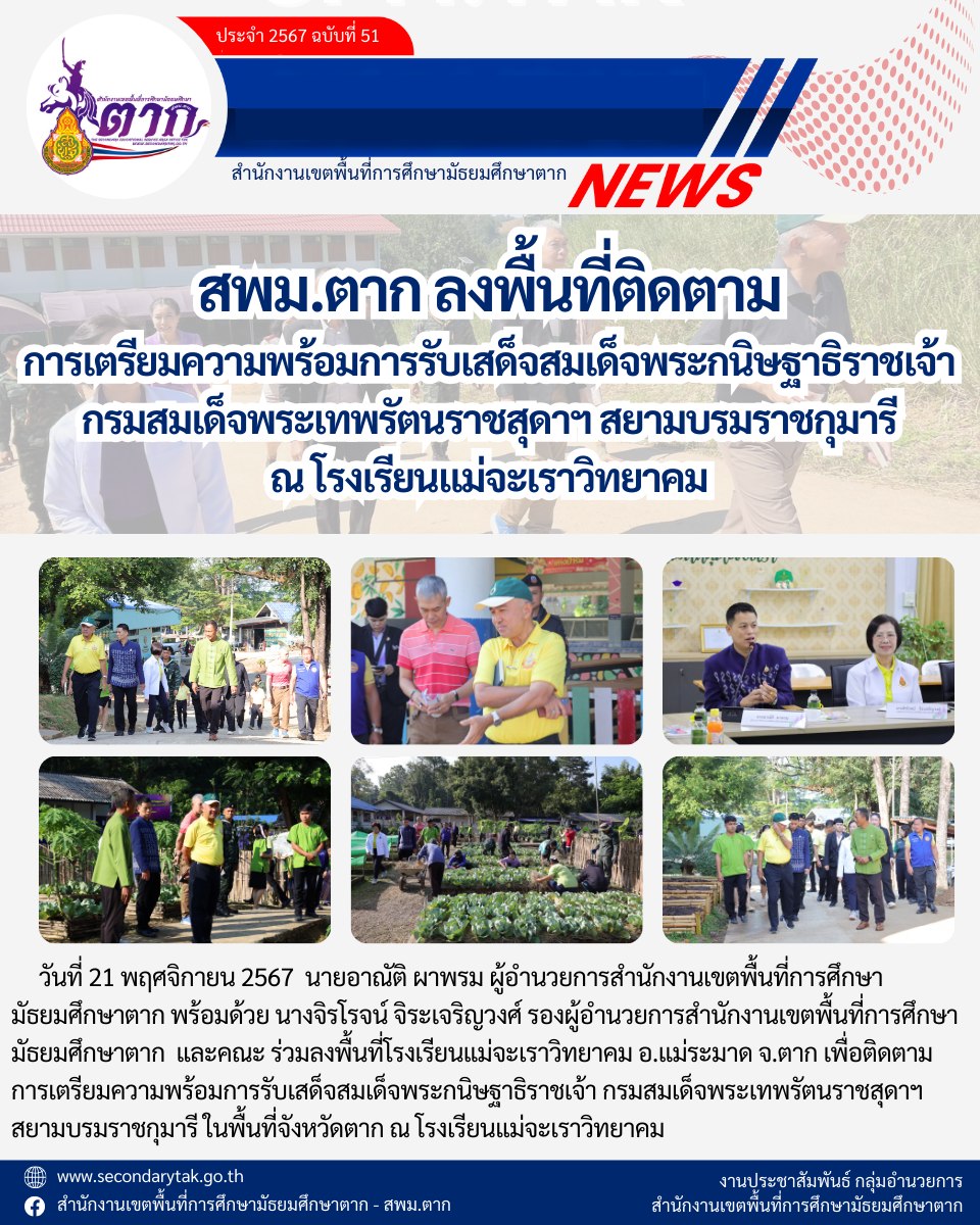 สพม.ตาก ลงพื้นที่ติดตาม การเตรียมความพร้อมการรับเสด็จสมเด็จพระกนิษฐาธิราชเจ้า กรมสมเด็จพระเทพรัตนราชสุดาฯ สยามบรมราชกุมารี ณโรงเรียนแม่จะเราวิทยาคม วรวุฒิ เนื้อนิ่ม 21 พฤศจิกายน 2567 จำนวนคนดู 10