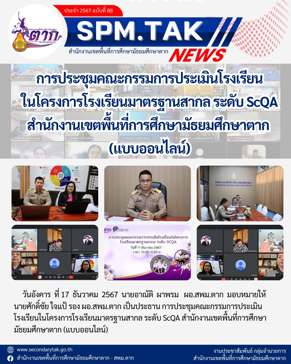 การประชุมคณะกรรมการประเมินโรงเรียน ในโครงการโรงเรียนมาตรฐานสากล ระดับ ScQA สำนักงานเขตพื้นที่การศึกษามัธยมศึกษาตาก (แบบออนไลน์) วรวุฒิ เนื้อนิ่ม 17 ธันวาคม 2567 จำนวนคนดู 2