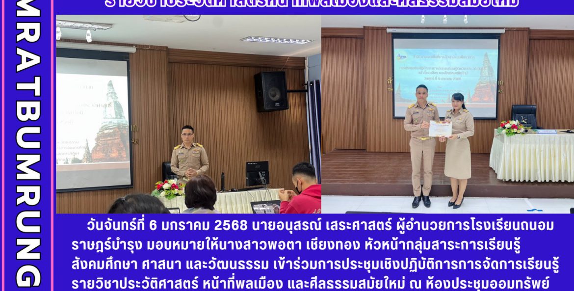 วันจันทร์ที่ 6 มกราคม 2568 นายอนุสรณ์ เสระศาสตร์ ผู้อำนวยการโรงเรียนถนอมราษฎร์บำรุง มอบหมายให้นางสาวพอตา เชียงทอง หัวหน้ากลุ่มสาระการเรียนรู้สังคมศึกษา ศาสนา และวัฒนธรรม เข้าร่วมการประชุมเชิงปฏิบัติการการจัดการเรียนรู้รายวิชาประวัติศาสตร์ หน้าที่พลเมือง และศีลธรรมสมัยใหม่ ณ ห้องประชุมออมทรัพย์สามัญ ชั้น 2 สำนักงานเขตพื้นที่การศึกษามัธยมศึกษาตาก